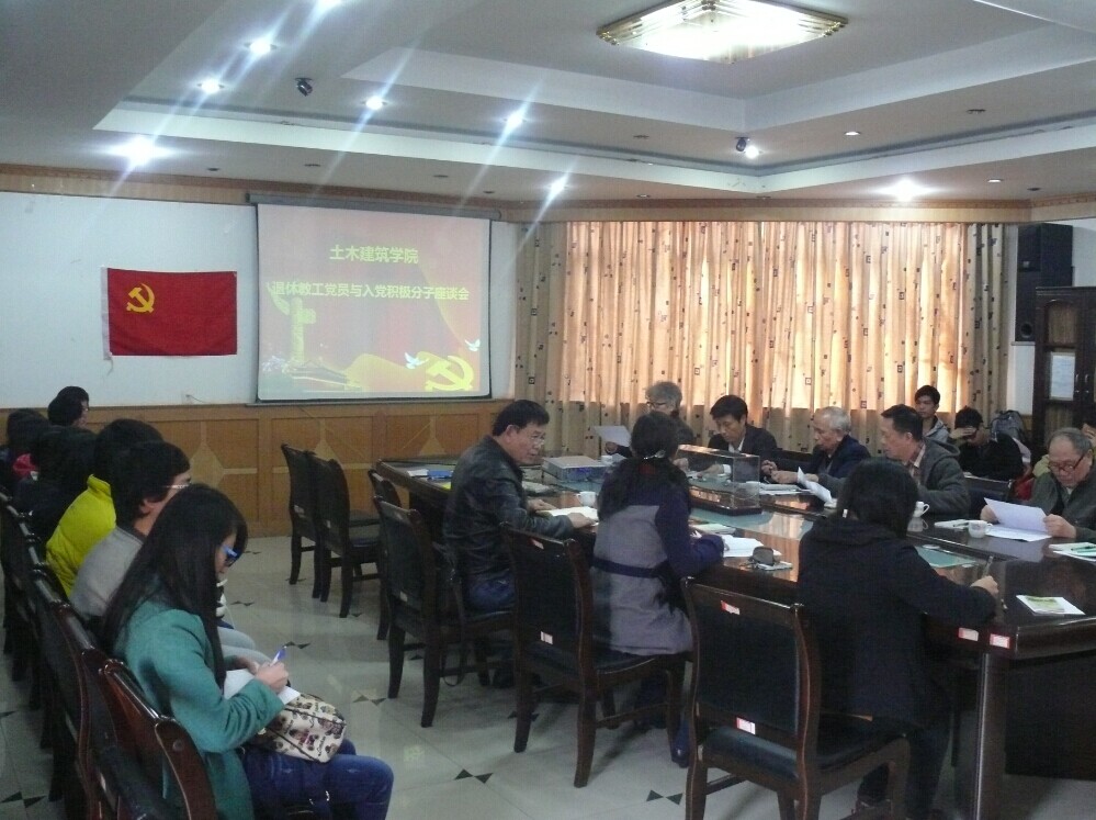 12月31日下午,土木建筑學(xué)院在學(xué)院三樓會議室召開退休教工黨員與入黨積極分子座談會。參加座談會的有關(guān)福漢、梁浩云、蔡健壯、張希貢、劉紹南、湯冰等六位退休教工黨員、學(xué)院院長兼黨總支書記周利、黨總支副書記李華、輔導(dǎo)員楊燕麗、學(xué)院新一批入黨積極分子及其培養(yǎng)聯(lián)系人。