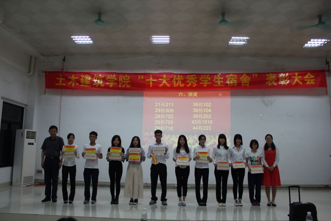 會(huì)上,周利院長(zhǎng)強(qiáng)調(diào)了學(xué)生宿舍管理對(duì)學(xué)風(fēng)建設(shè)的重要作用,同時(shí)指出學(xué)院各項(xiàng)工作緊緊圍繞人才培養(yǎng)方案展開,以促進(jìn)學(xué)生德智體美全面發(fā)展。隨后,由律委會(huì)負(fù)責(zé)人吳興邦解說、播放土建學(xué)院學(xué)生自律委員會(huì)宣傳視頻,展示我院宿舍管理學(xué)生干部隊(duì)伍的風(fēng)采。接著,十大優(yōu)秀學(xué)生宿舍代表通過演講和視頻、PPT等形式,一一介紹其成績(jī)及經(jīng)驗(yàn)做法,為全院學(xué)生起到良好示范作用。最后,黨總支副書記李華宣讀了《五邑大學(xué)土木建筑學(xué)院2014-2015學(xué)年度第一學(xué)期“十大優(yōu)秀學(xué)生宿舍”表彰決定》,學(xué)院領(lǐng)導(dǎo)為受表彰宿舍頒獎(jiǎng)。