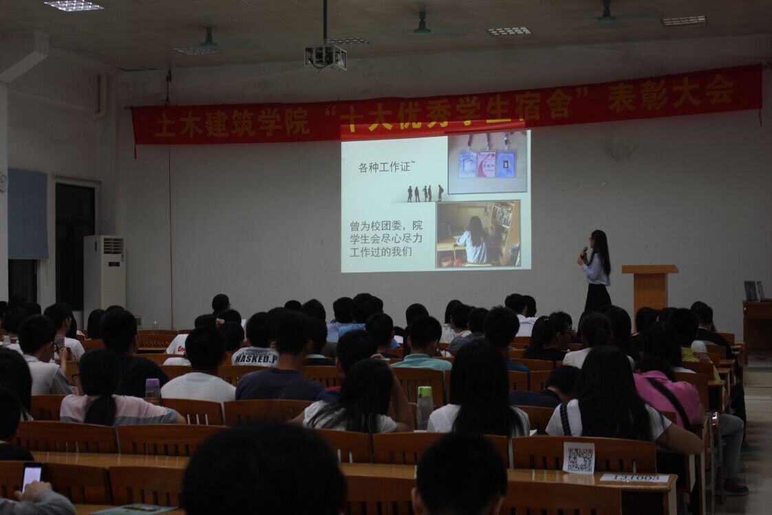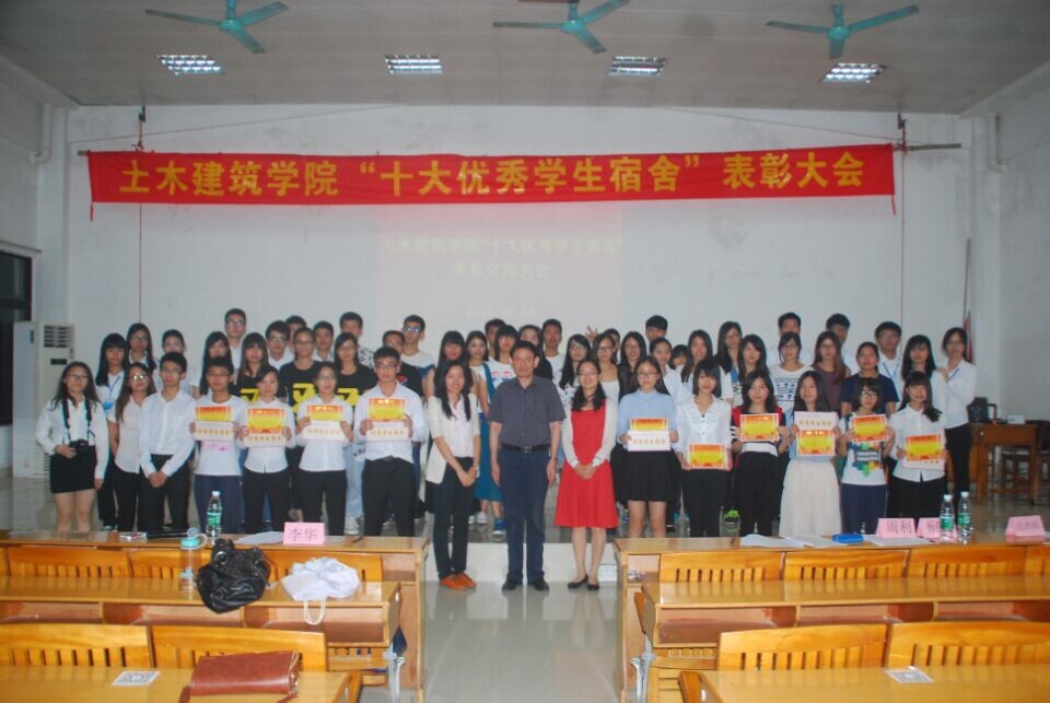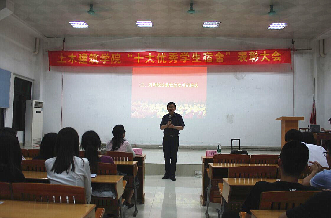 2015年4月24日晚,土木建筑學(xué)院“十大優(yōu)秀學(xué)生宿舍”表彰大會(huì)在學(xué)生活動(dòng)中心二樓報(bào)告廳召開。院長(zhǎng)兼黨總支書記周利、黨總支副書記李華、輔導(dǎo)員楊燕麗和獲獎(jiǎng)宿舍成員、樓層長(zhǎng)、近140名學(xué)生宿舍舍長(zhǎng)及律委全體人員參加了大會(huì)。會(huì)議由黨總支副書記李華主持。