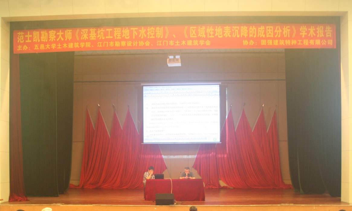 5月13日上午9時,由我校土木建筑學院、江門市勘察設計協會和江門市土木建筑學會主辦、固強建筑特種工程有限公司協辦的巖土工程專題學術報告會在呂志和禮堂舉行。近200名企業同行人士、土木建筑學院相關專業老師及近150名學生參加了學術報告會。會議由土建學院科研副院長李本強主持。