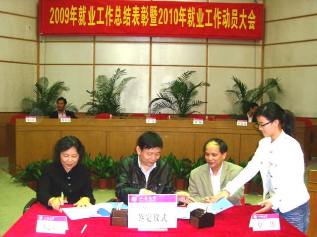 2010年3月30日星期二下午3點(diǎn),2009年就業(yè)工作總結(jié)表彰暨2010年就業(yè)工作動(dòng)員大會(huì)在十友樓召開。會(huì)上,我院黨總支書記蘇俊華老師作為2009年就業(yè)工作先進(jìn)集體代表上臺(tái)發(fā)言,隨后院長和書記與卓副校長簽訂了“2010年就業(yè)工作責(zé)任書”。