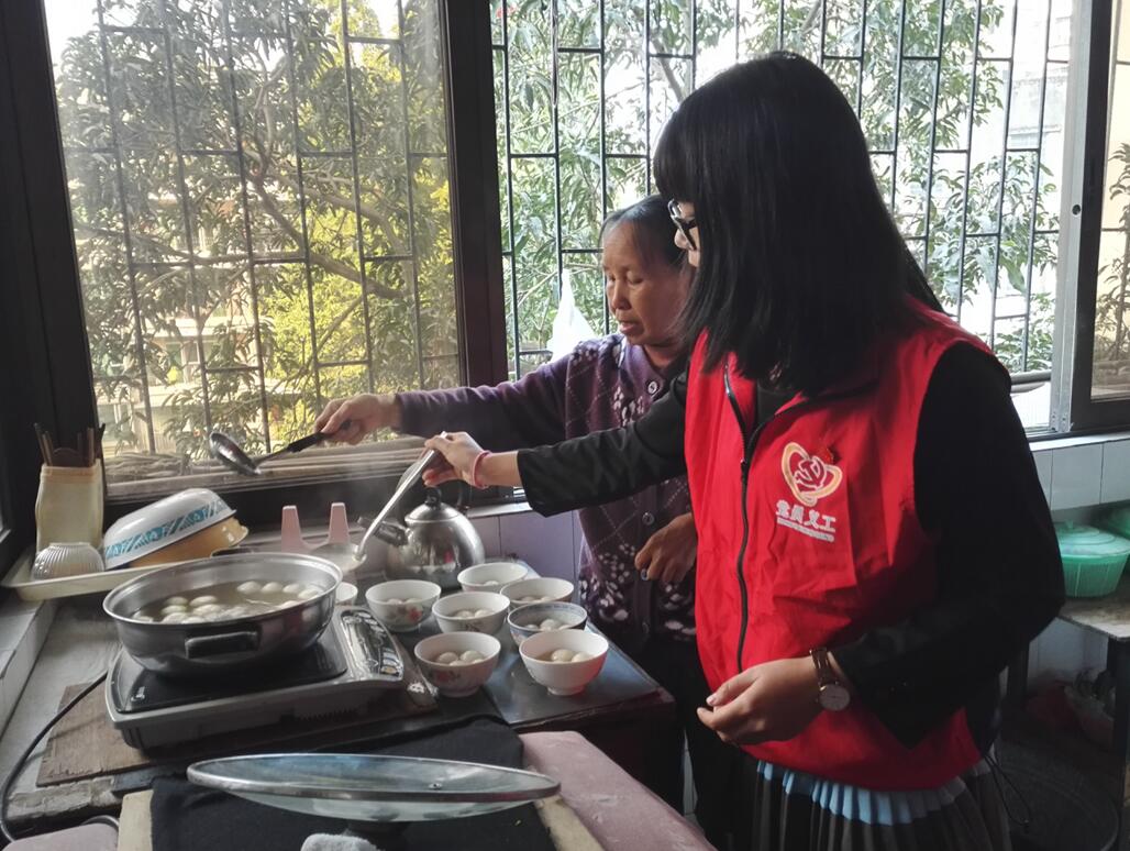 東成社區退休老人卿姨和喜姨們對大家的到來表示由衷的喜悅,并與志愿者一起煮湯圓,團團圓圓。
