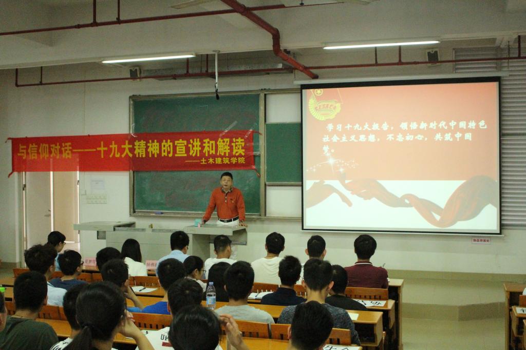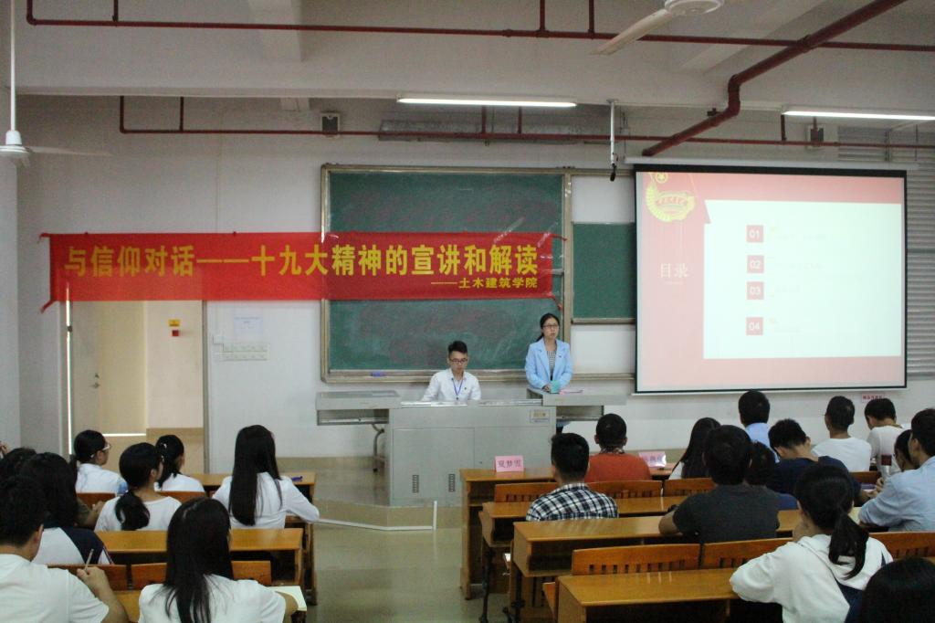 10月24日,土木建筑學院開展“與信仰對話”十九大精神宣講會,宣講會在北主樓604進行,本次會議的參與人員有學院黨總支書記吳卓強,土木建筑學院團總支總書記夏夢雪老師,土建學院輔導員楊燕麗老師、輔導員胡偉堅老師,以及土建學院團總支、學生會、律委、心理健康協會與創新創業協會全體成員。本次會議主持人為夏夢雪老師。