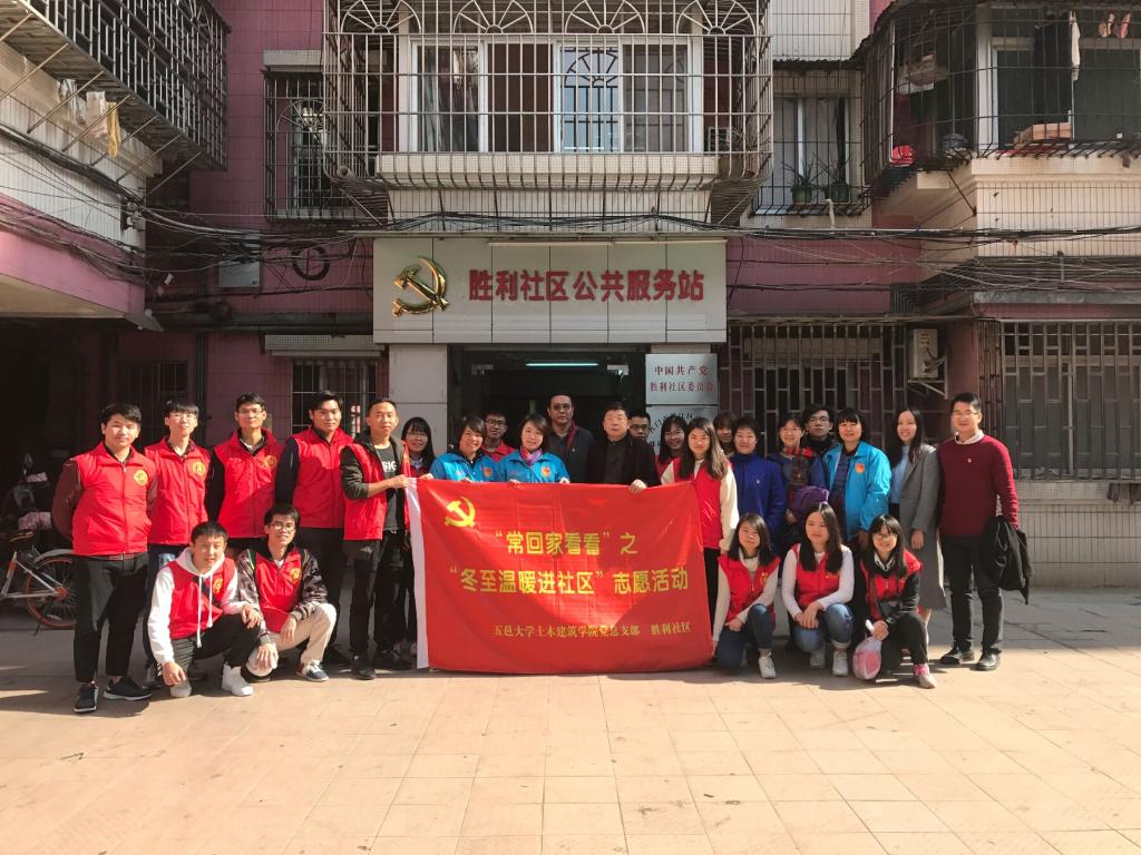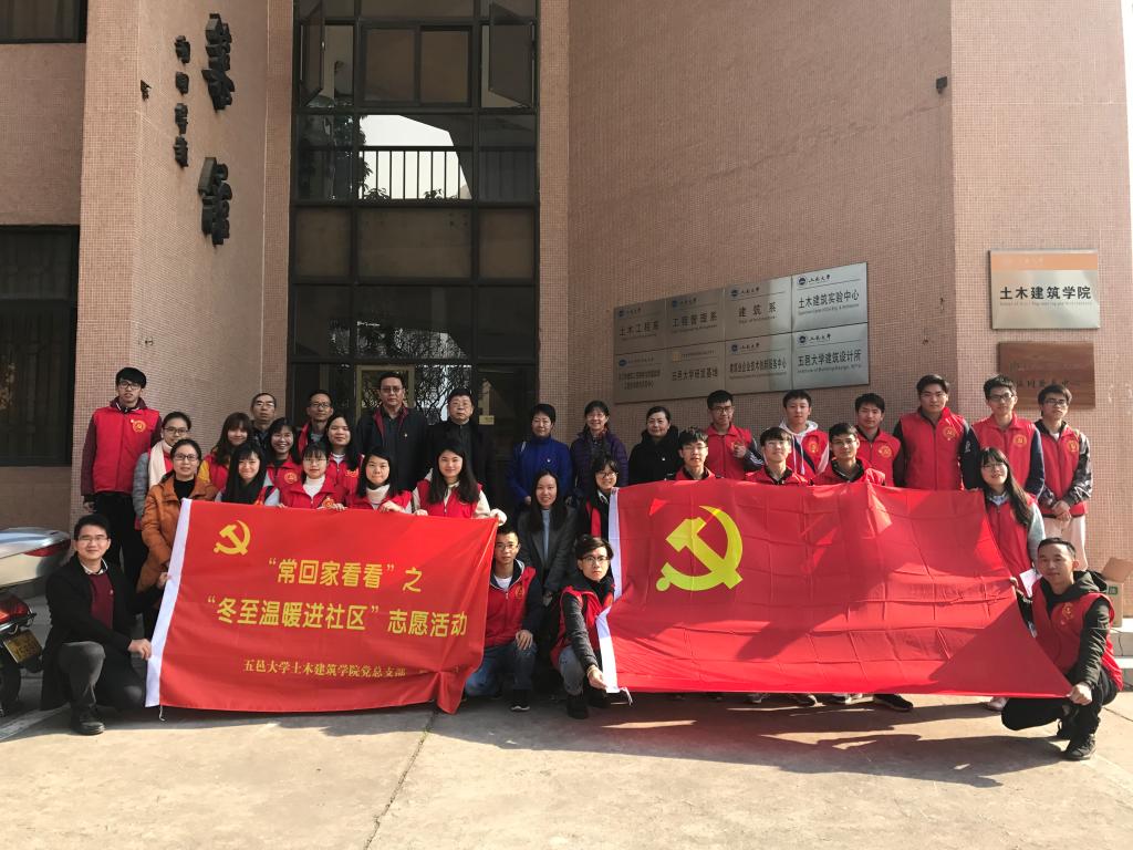 為深入學習貫徹黨的十九大精神,發揮黨員志愿服務精神,2017年12月22日,五邑大學土木建筑學院師生黨員一行三十多人到豐樂社區、勝利社區舉行“常回家看看——冬至溫暖進社區活動”,為老黨員、退休老人帶去節日問候,送上了水果、湯圓等慰問品,向老黨員們傳達“十九大”精神,給退休老人原本寂靜的家里帶去了歡聲笑語,讓他們深切的感受到兒女繞膝般的溫情和濃濃的節日氛圍。
