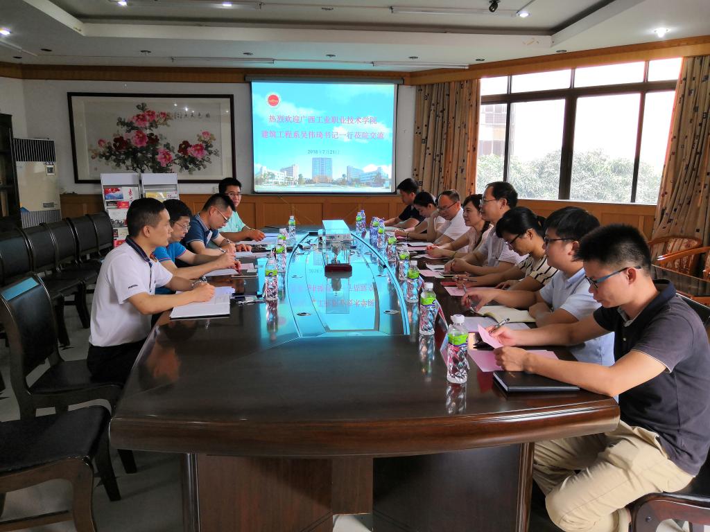 7月21日上午,廣西工業(yè)職業(yè)技術(shù)學(xué)院建筑工程系吳偉琦書記一行8人來(lái)土木建筑學(xué)院調(diào)研交流,學(xué)院黨總支書記/黨支部書記吳卓強(qiáng)、副院長(zhǎng)王連坤、副書記倪兵兵及輔導(dǎo)員老師胡偉堅(jiān)參加了座談會(huì)。