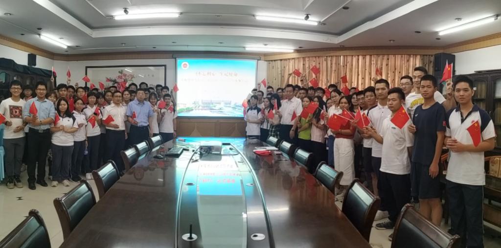 直播結束后,學院黨總支書記吳卓強老師,院長周利老師,黨總支副書記倪兵兵老師,輔導員胡偉堅老師、陳美玲老師等從呂志和禮堂觀看直播結束后一同前往308會議室與參會師生熱烈討論慶典中的精彩場景,分享著自己的心得和感悟,并一同合影。(文/圖 土木建筑學院)