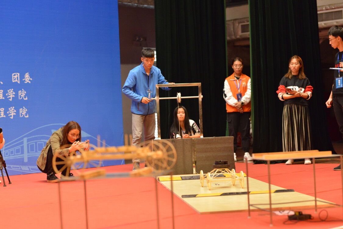 比賽主要考核車輛模型承重與抗路面沖擊,現(xiàn)場設(shè)置兩級加載項:第一級為靜載放置砝碼10秒,砝碼重6~10kg;第二級為動載放置4~8kg的砝碼駛過兩個減速帶。現(xiàn)場模型設(shè)計各具特色,荷載能力各有不同,比賽現(xiàn)場觀賞性、趣味性凸顯,大賽在技術(shù)總指導(dǎo)聶振華副教授介紹比賽規(guī)則、加載預(yù)演后正式開始,經(jīng)過激烈角逐,廣州大學(xué)的“陽江豬腸綠”獲得本次比賽的特等獎,五邑大學(xué)的“勝利沖鋒隊”、廣東工業(yè)大學(xué)的“創(chuàng)意車隊”、深圳大學(xué)的“遠航號”、東莞理工學(xué)院的“代表隊1隊”四支隊伍獲得一等獎,暨南大學(xué)的“石牌街生產(chǎn)隊”、東莞理工學(xué)院的“代表隊2隊”、暨南大學(xué)的“打醬油隊”、暨南大學(xué)的“全場最佳”、佛山科學(xué)技術(shù)學(xué)院的“九五加滿”、五邑大學(xué)的“小小攻城獅”獲得二等獎,暨南大學(xué)的“城市超低空飛行器”、五邑大學(xué)的“小豬快跑”等10支隊伍獲得三等獎。最佳新秀獎由五邑大學(xué)“中班隊”和暨南大學(xué)“石牌街生產(chǎn)隊”獲得,最佳設(shè)計計算獎由深圳大學(xué)的“遠航者”獲得,最佳制作獎、最佳創(chuàng)意獎分別由暨南大學(xué)的“打醬油隊”、“彩虹號”獲得。