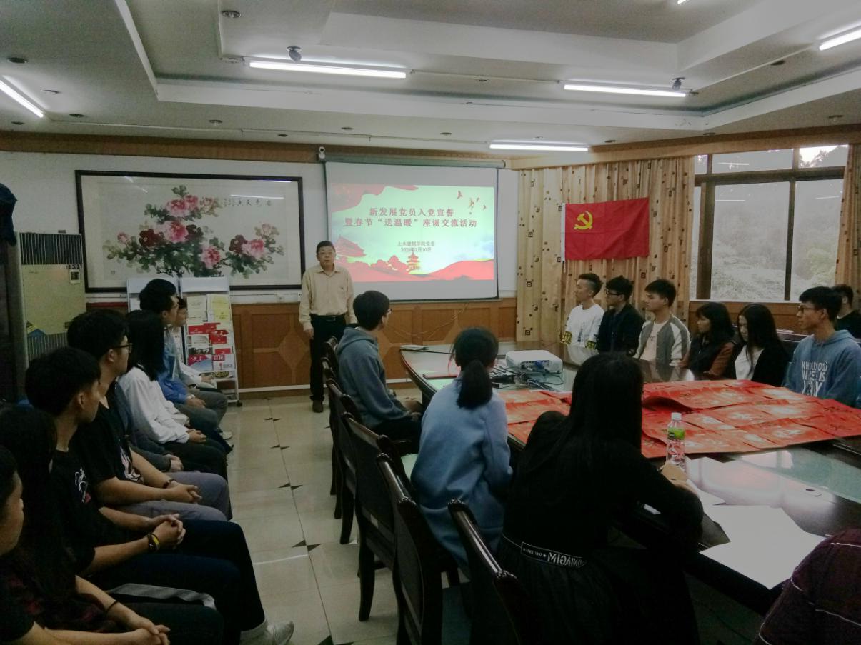 為了深入學(xué)習(xí)貫徹黨的十九屆四中全會精神,推進(jìn)“不忘初心、牢記使命”主題教育,土木建筑學(xué)院黨委于2020年1月10日下午,在偉倫建筑館三樓會議室舉行了新黨員入黨宣誓儀式暨新春“送溫暖”座談交流活動(dòng)。學(xué)院黨委書記吳卓強(qiáng)、副書記倪兵兵,學(xué)生支部書記代表、全體輔導(dǎo)員、新發(fā)展的23名預(yù)備黨員、新轉(zhuǎn)正18名正式黨員及其他黨員代表參加了活動(dòng)。活動(dòng)由五邑大學(xué)兼職組織員、輔導(dǎo)員胡偉堅(jiān)主持。