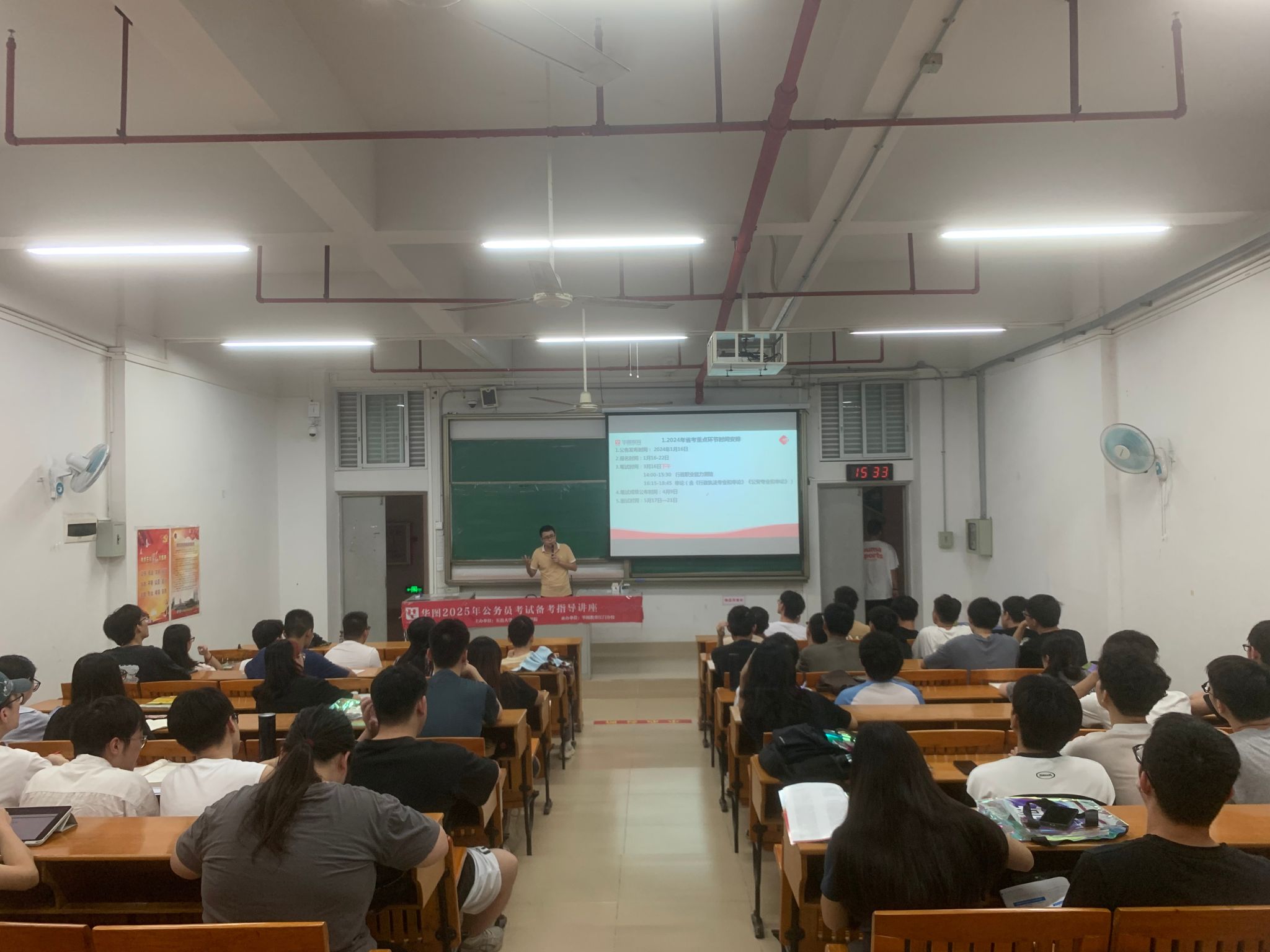 為加深同學們對公務員考試的認識,提供精準化、科學化、系統化的報考指南和學習輔導,進一步促進學院學生高質量就業,2024年6月25日,土木建筑學院邀請華圖教育江門分校于北主樓303舉辦公務員考試備考指導講座。本次講座特邀華圖教育資深講師梁飛來進行主講,吸引了大二、大三年級約90名學生的積極參與。