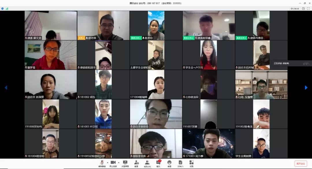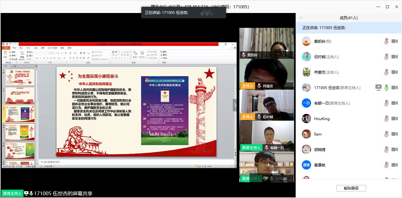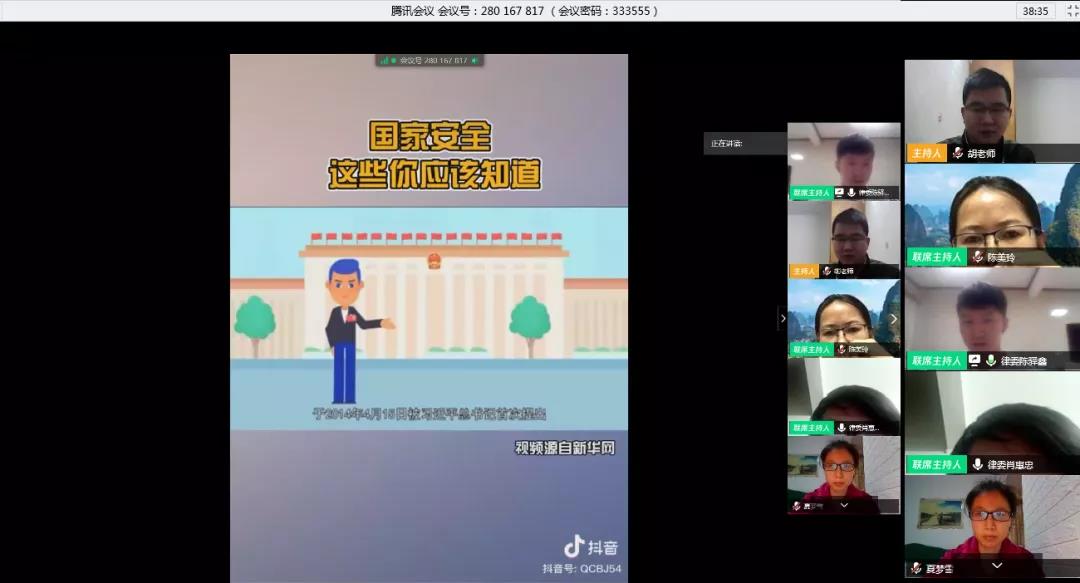 2020年4月14日晚,土木建筑學院召開了2020年國家安全專題教育活動視頻動員會議。學院輔導員老師夏夢雪、胡偉堅、陳美玲等參加了此次“云會議”,并分別做了發言。參加會議的還有學院“三會兩協”主要負責人和各班副班長。本次視頻會議由“律委”主任肖惠忠主持。4月15日晚,在兼職組織員、輔導員胡偉堅老師的組織下,學院學生黨支部全體黨務助理通過學習強國視頻會議,結合疫情防控時期學院學生黨建工作的實際,也開展了2020年國家安全專題教育活動。視頻會議后,學生黨員們紛紛表示,表示通過本次教育活動,有效強化了自己的總體國家安全觀,增加了自己對國家安全有關知識的了解,增強了自己自覺維護國家安全的責任感和使命感。將繼續敢于創新、腳踏實地,堅定理想信念和扎實的工作作風,努力實現小我、帶動他人、成就大我和服務社會,為堅決打贏這場疫情防控戰貢獻了青春力量。
