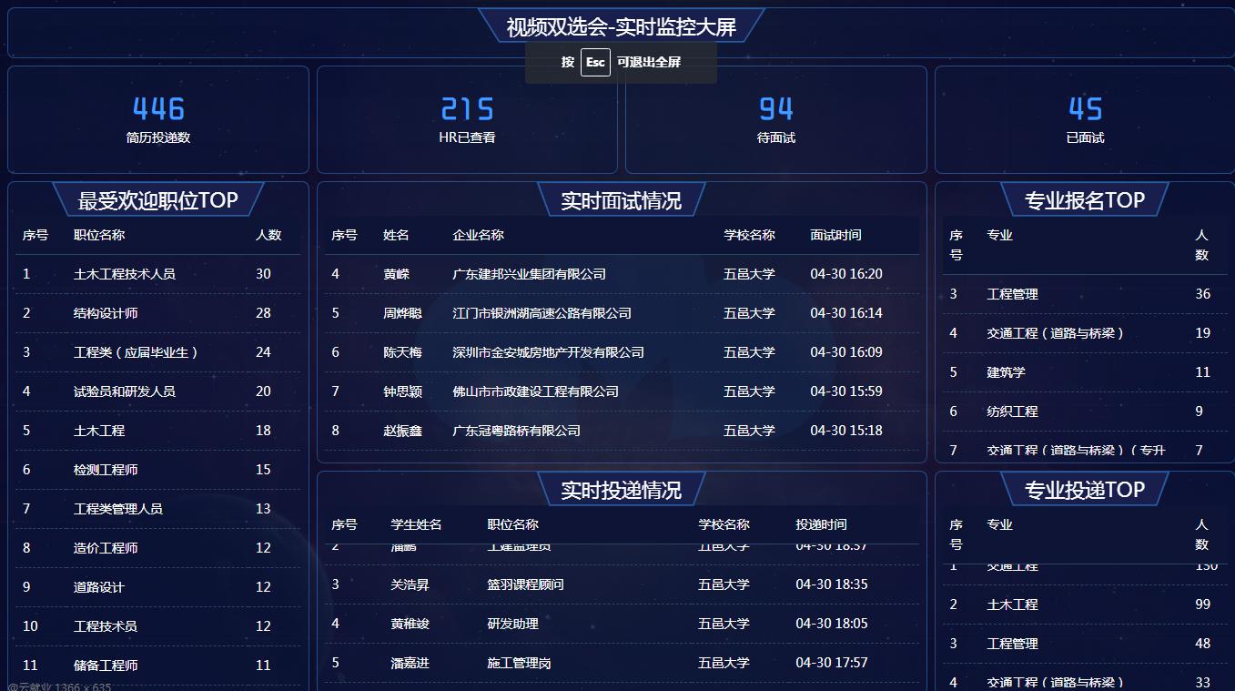 為進(jìn)一步做好2020屆畢業(yè)生就業(yè)工作,由學(xué)校就業(yè)指導(dǎo)與服務(wù)中心主辦、土木建筑學(xué)院承辦的五邑大學(xué)2020屆畢業(yè)生線上雙選會(huì)第六場(土建專場),于4月30日(星期四)9時(shí)至22時(shí)在“云就業(yè)”平臺(tái)順利舉行。本場線上雙選會(huì)共有66家用人單位參與,提供優(yōu)質(zhì)崗位超過211個(gè),招聘需求2519人以上。截至當(dāng)天22:00 時(shí),“入場 ”參加線上視頻雙選的求職者超過311人,向參會(huì)企業(yè)投遞簡歷446份,預(yù)約視頻面試139人次(完成面試45人次)。