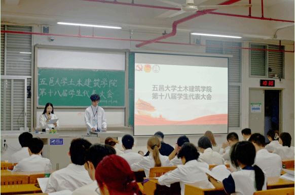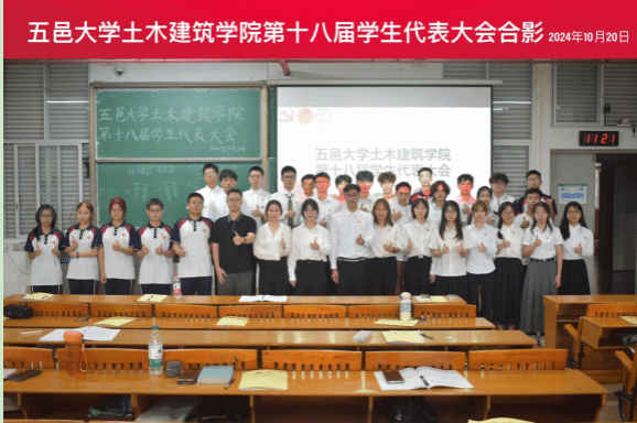 2024年10月20日,五邑大學土木建筑學院第十八屆學生代表大會在北主樓205順利召開。學生會指導老師林志豪、第十八屆學生會工作人員、各候選人以及各班學生正式代表、列席代表等共計30余人參與了本次會議。大會由彭嘉怡和蔣繼鑄主持。