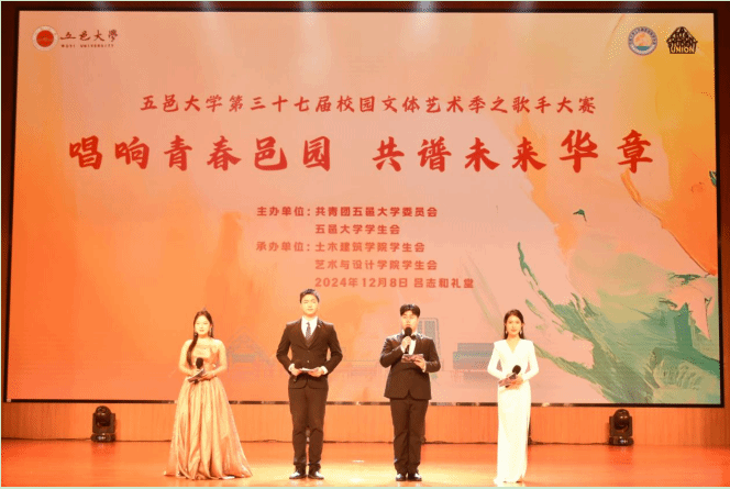 2024年12月8日,由共青團五邑大學(xué)委員會、五邑大學(xué)學(xué)生會主辦,土木建筑學(xué)院學(xué)生會、藝術(shù)與設(shè)計學(xué)院學(xué)生會承辦的五邑大學(xué)第三十七屆文體藝術(shù)季之歌手大賽在呂志和禮堂隆重舉行。土木建筑學(xué)院黨委書記許皓、藝術(shù)與設(shè)計學(xué)院黨委副書記韋金艷、各學(xué)院團委書記及學(xué)生會指導(dǎo)老師出席本次活動。本次大賽邀請到了戴佳榮、馮明曦、林晶晶老師擔(dān)任專業(yè)評委。決賽現(xiàn)場吸引了包括國際教育學(xué)院首批來華留學(xué)生在內(nèi)的近千名邑大學(xué)子到場觀看。 本次大賽以“唱響青春邑園,共譜未來華章”為主題,覆蓋面廣、參與度高,經(jīng)過初賽選拔,來自國際教育學(xué)院、文學(xué)院、電子與信息工程學(xué)院等15個學(xué)院選手決賽現(xiàn)場同臺競技。決賽現(xiàn)場分為《聯(lián)聲韻·青春邑園》《獨音魁·青春強音》《齊歌賦·青春共鳴》三個篇章,環(huán)節(jié)編排新穎巧妙,表演內(nèi)容精彩紛呈,賽場氣氛熱烈非凡。比賽過程中,選手深情地演繹和表達對歌曲的理解,展現(xiàn)出邑大學(xué)子蓬勃的青春活力、無限的創(chuàng)意潛能以及對未來的美好憧憬。大賽最后,包括首次參賽的所羅門群島留學(xué)生在內(nèi)全體選手帶來《相親相愛》歌曲大合唱,在美輪美奐的燈光與音效中,引得現(xiàn)場觀眾歡呼連連、掌聲不斷、全程合唱,手中熒光棒匯成璀璨海洋,歌手大賽在歡樂祥和、溫馨有愛的氛圍中圓滿落幕。本次歌手大賽不僅為我校學(xué)子提供了一個展示才華的青春舞臺,更為不同文化民族之間交流搭建起橋梁,進一步彰顯了邑大學(xué)子團結(jié)友愛、多元共融的精神風(fēng)貌。