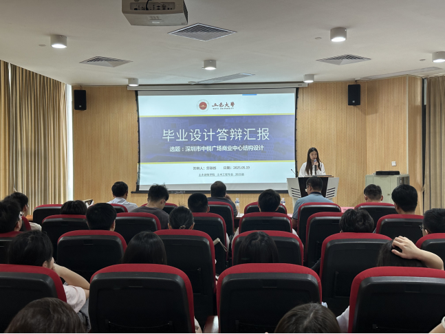 2025年5月19日上午,土木建筑學院在學生服務中心314報告廳舉行2025屆本科畢業設計公開答辯。廣東鏵建設計有限公司結構總工曹智泉、廣東千福田工程造價咨詢有限公司技術負責人李卿、江門市建筑設計院總建筑師吳洪杰、中鐵廣州工程局集團有限公司項目總工范偉四名企業和行業專家作為答辯專家,土木建筑學院領導班子、系主任、專業負責人、專業教師代表和學生參加了公開答辯活動。