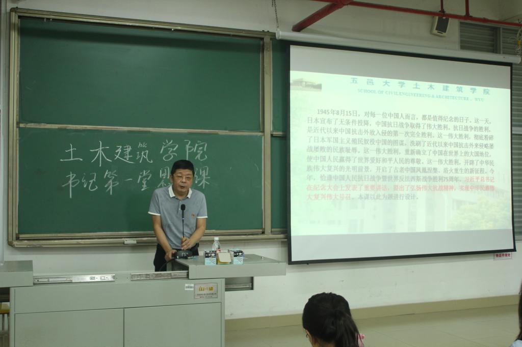 吳卓強書記以《弘揚偉大抗戰(zhàn)精神,勇于擔當時代責任》為主題,圍繞習近平總書記在紀念中國人民抗日戰(zhàn)爭暨世界反法西斯戰(zhàn)爭勝利75周年大會上的重要講話,向同學們深情地講述了中國人民抗戰(zhàn)歷程,詮釋了偉大的抗戰(zhàn)精神的內涵,并結合習近平總書記就弘揚偉大抗戰(zhàn)精神,實現(xiàn)中華民族偉大復興五方面要求和對青年擔當盡責、成長成才提出的六點期望,向同學們提出3點希望,一是希望土建的學子們志存高遠、忠于祖國,努力做新時代具有遠大理想和堅定信念的愛國者;二是希望土建的學子們敢于擔當、勇于奮斗,努力做新時代具有責任意識和創(chuàng)新精神的建設者;三是希望土建的學子們勤奮學習、錘煉身心,努力做新時代具有過硬本領和高尚品格的接班人。