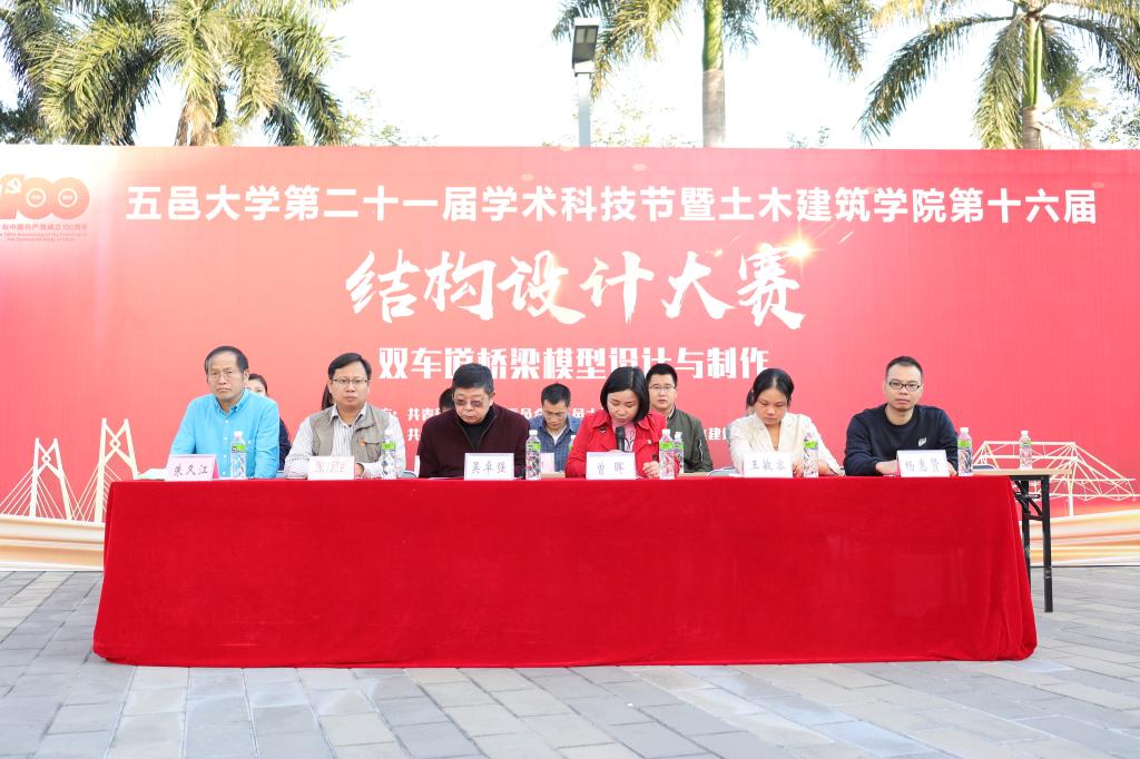 為培養(yǎng)大學生的創(chuàng)新思維與團隊精神,提高大學生工程結(jié)構(gòu)設(shè)計與實踐能力,促進我校“創(chuàng)新創(chuàng)業(yè)教育體系”發(fā)展,正值建黨百年之際,土木建筑學院在學生綜合服務中心一樓隆重舉行了第十六屆結(jié)構(gòu)設(shè)計大賽。全院領(lǐng)導班子、全體輔導員老師出席本次活動。本次大賽由土木建筑學院黨委書記吳卓強主持。本次大賽的評委老師有:王敏容、朱久江、陳孔亮、周志軍、張文志、楊超、楊惠賢、張炯。
