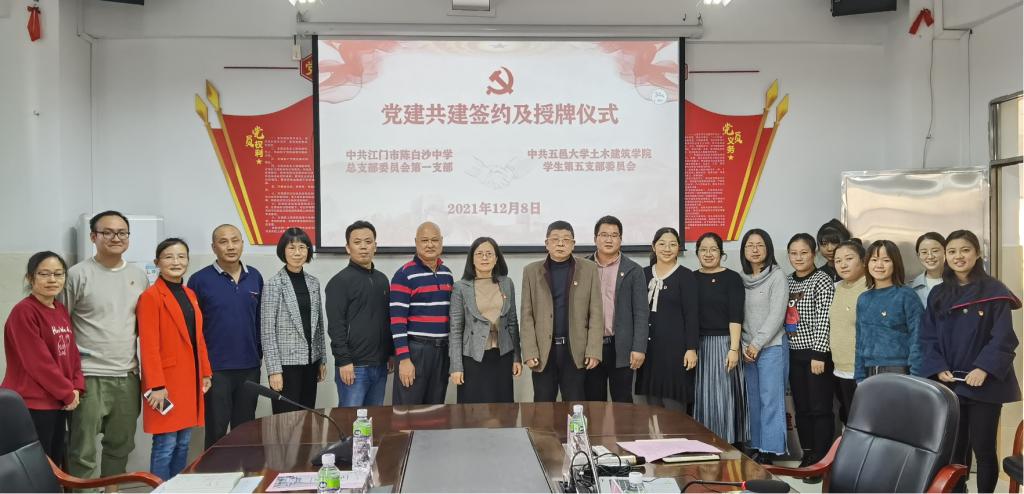 為加強(qiáng)黨建工作學(xué)習(xí)交流,實(shí)現(xiàn)資源共享,優(yōu)勢(shì)互補(bǔ),共促共贏,開(kāi)創(chuàng)黨建工作的新局面,充分發(fā)揮黨支部戰(zhàn)斗堡壘和黨員的先鋒模范作用。立足僑鄉(xiāng)本土紅色資源,通過(guò)大中小學(xué)思政教師、大中小學(xué)生同臺(tái)分享,堅(jiān)守“為黨育人 為國(guó)育才”初心,努力打通大中小學(xué)思政教育教學(xué),讓中國(guó)共產(chǎn)黨信仰教育、愛(ài)國(guó)主義教育、社會(huì)主義核心價(jià)值觀教育貫穿學(xué)生成長(zhǎng)的各個(gè)階段。2021年12月8日下午,五邑大學(xué)土木建筑學(xué)院學(xué)生第五黨支部與江門市陳白沙中學(xué)第一黨支部舉行黨建共建簽約儀式。江門市陳白沙中學(xué)黨總支書(shū)記/黨支部書(shū)記、校長(zhǎng)吳儉開(kāi),五邑大學(xué)土木建筑學(xué)院黨委書(shū)記吳卓強(qiáng)等出席。活動(dòng)由陳白沙中學(xué)黨總支部委員、第二黨支部書(shū)記馮潔文主持。