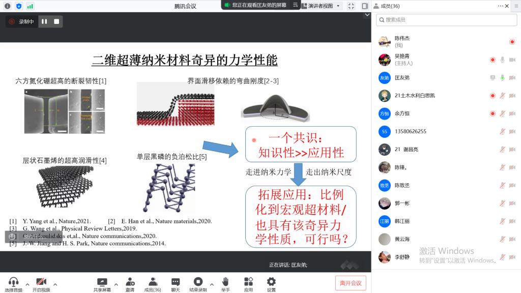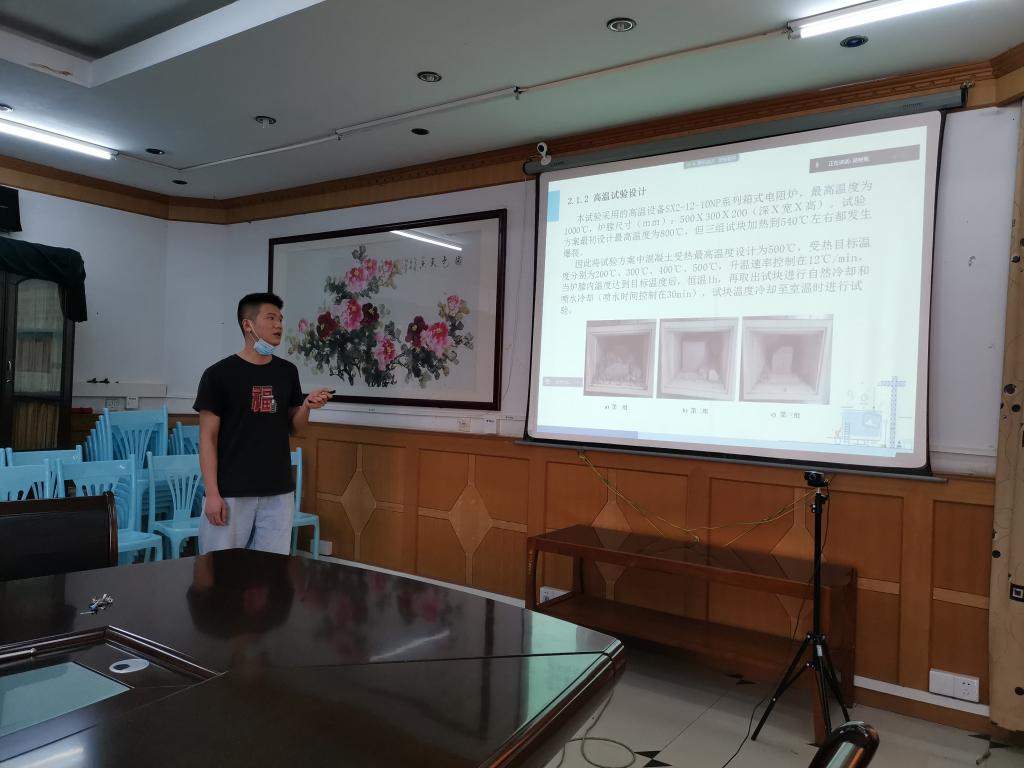 首先,曾暉院長簡要介紹了近期畢業(yè)論文盲審情況及兩位匯報人。然后,由匡友弟副院長作題為《基于超薄boat-graphane的宏觀力學(xué)超材料》的前沿學(xué)術(shù)報告,主要介紹了超薄2D納米材料boat-graphane的非經(jīng)典剛度關(guān)系,非經(jīng)典剛度關(guān)系的機(jī)制分析及力學(xué)超材料的設(shè)計。接著,本學(xué)院2019級碩士研究生蔡凱鵬以《高溫后再生自密實混凝土力學(xué)性能研究》為題作科研進(jìn)展報告,介紹了在不同取代率、溫度和冷卻方式條件下再生自密實混凝土的力學(xué)性能變化規(guī)律。最后,曾暉院長對本次大會作了總結(jié)。