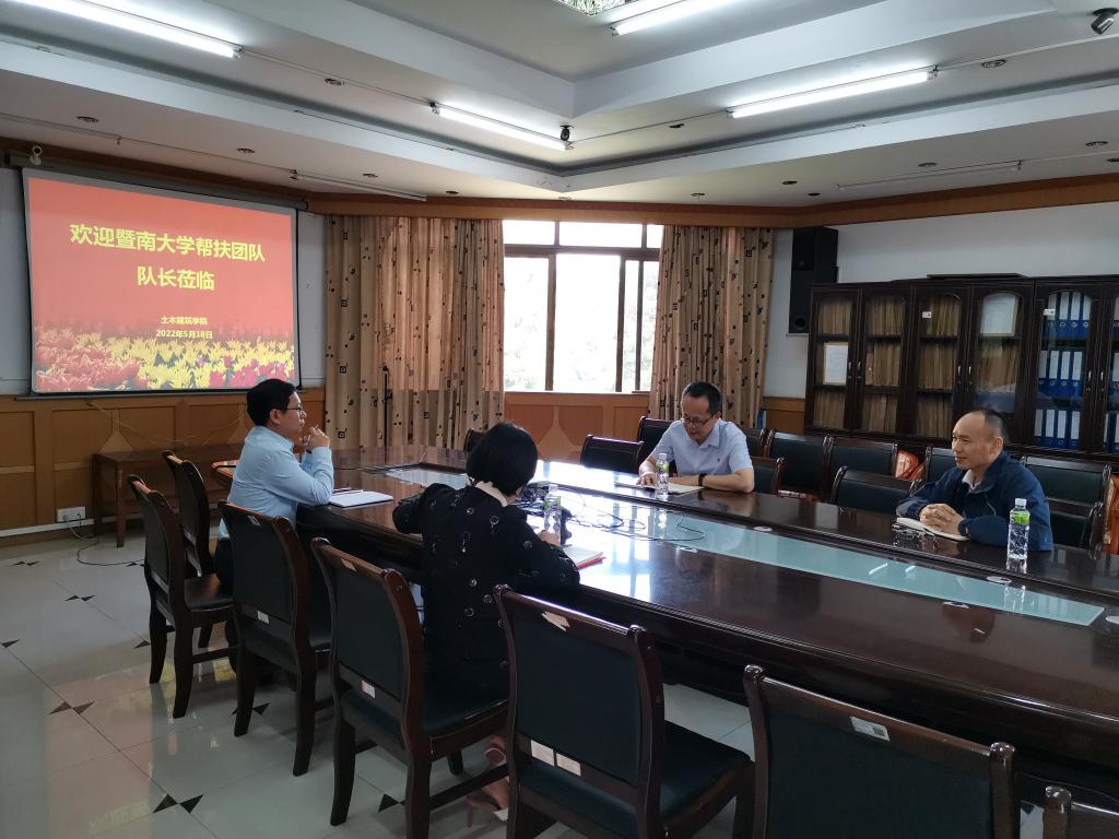 2022年5月18日上午,暨南大學(xué)幫扶工作隊(duì)負(fù)責(zé)人、暨南大學(xué)黨委委員、暨南大學(xué)信息科學(xué)技術(shù)學(xué)院黨委書(shū)記盧健民赴五邑大學(xué)土木建筑學(xué)院就如何進(jìn)一步推動(dòng)學(xué)院研究生培養(yǎng)、科研工作進(jìn)行交流。土木建筑學(xué)院院長(zhǎng)曾暉,主管研究生工作副院長(zhǎng)張萬(wàn)勝,暨南大學(xué)幫扶工作隊(duì)隊(duì)員、學(xué)院副院長(zhǎng)匡友弟參加了此次交流。