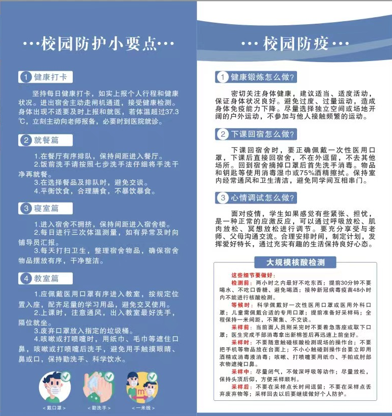手冊制作過程中,支部師生廣泛收集相關素材、多次開會討論手冊版塊內容。結合同學們學習、生活、出行等場景的防護重點,手冊設置校園健康打卡篇、就餐篇、寢室篇、教室篇、健康鍛煉篇、心情調試篇、核酸檢測篇等欄目,幫助同學們系統全面了解新冠肺炎病毒的特征以及校園防控相關知識,引導同學們落實好健康的第一責任人責任。