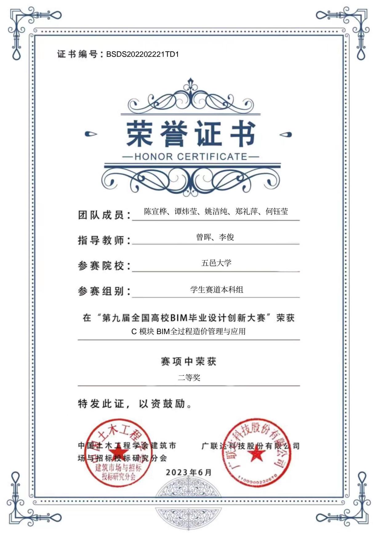 近日,第九屆全國高校BIM畢業(yè)設(shè)計創(chuàng)新大賽(The 9th National College BIM Graduation Design Innovation Competition)獎項正式公布。本屆大賽由中國土木工程學(xué)會建筑市場與招標投標研究分會、廣聯(lián)達科技股份有限公司主辦,以“匠心筑夢 數(shù)建未來”為主題,旨在貫徹落實國家“十四五”規(guī)劃有關(guān)“加快數(shù)字化發(fā)展,建設(shè)數(shù)字中國”戰(zhàn)略部署,加快建筑行業(yè)數(shù)字化人才培養(yǎng),融合行業(yè)新技術(shù)、新需求與傳統(tǒng)教學(xué),全面提高大學(xué)生的創(chuàng)新思維和科研能力;同時,提高全國高校大學(xué)生對數(shù)字建筑的認知,搭建相互交流、學(xué)習(xí)、展示的平臺,以賽促教、以賽促學(xué)、以賽促創(chuàng),在新形勢下更好地發(fā)展新興技術(shù)。本次大賽共有580余家院校,5600余支團隊,30000余名師生參賽,共計提交作品4000余份。我校土木建筑學(xué)院工程管理系學(xué)子積極備賽,奮力拼搏,最終我校的三支參賽隊伍分別獲得國家級二等獎1項、國家級三等獎1項、國家級優(yōu)秀獎1項的優(yōu)異成績。