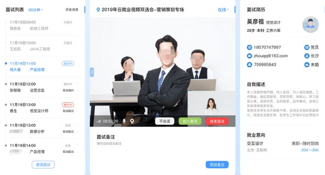 1.用人單位端:在線發布職位信息,收發簡歷,人才在線邀請對接,分專業、系別、意愿進行分類篩選人才,即時聊天,群發通知等。