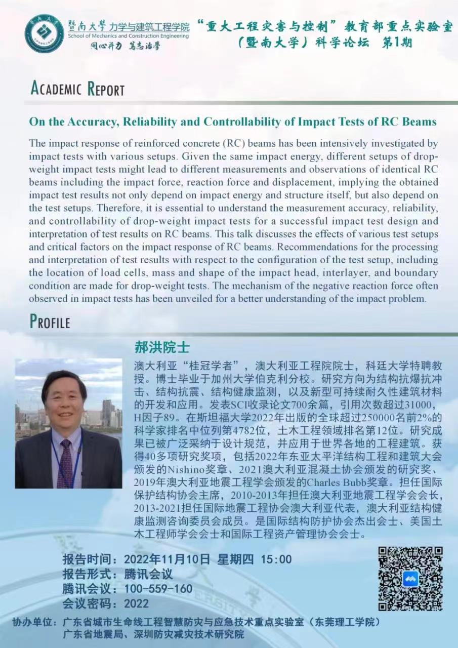報告主題:“重大工程災害與控制”教育部重點實驗室(暨南大學)科學論壇 第1期