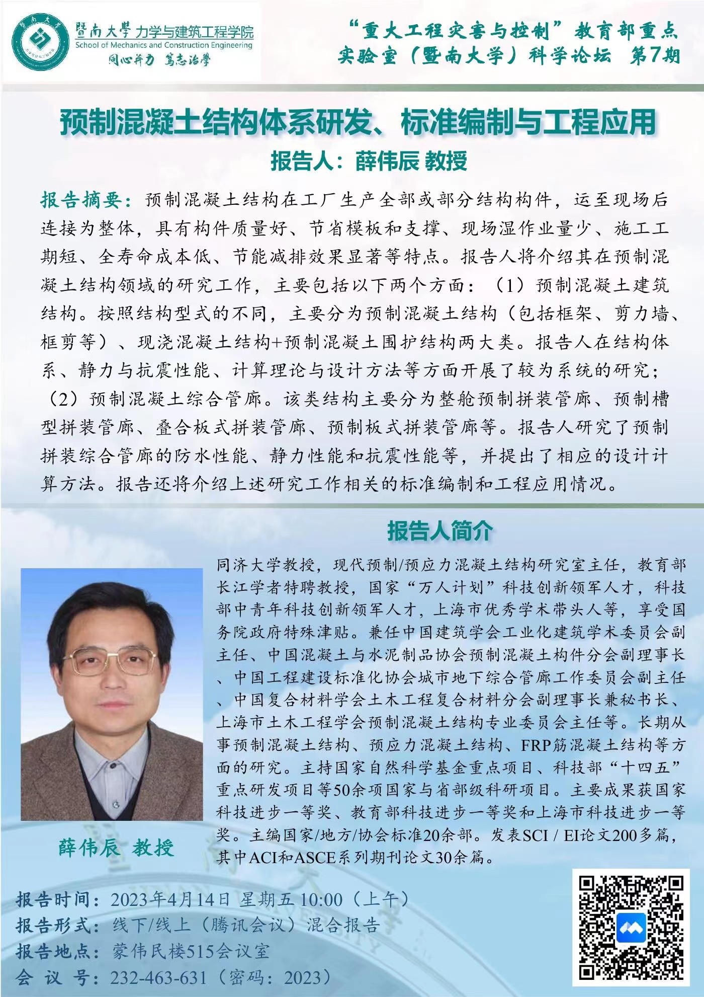 報告主題:《預制混凝土結構體系研發、標準編制與工程應用》學術講座暨“重大工程災害與控制”教育部重點實驗室(暨南大學)科學論壇 第7期