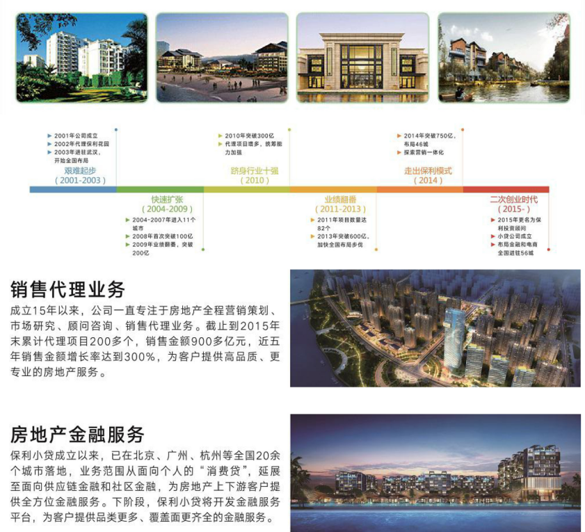 保利地產(chǎn)投資顧問(wèn)有限公司于 2001 年成立,公司員工 4000 余人,覆蓋廣州、北京、上海、天津等 60 多個(gè)國(guó)內(nèi)大中型城市。公司從單一地產(chǎn)營(yíng)銷(xiāo)業(yè)務(wù)向客戶全生命周期地產(chǎn)金融服務(wù)業(yè)務(wù)發(fā)展,并對(duì)多元?jiǎng)?chuàng)新業(yè)務(wù)相關(guān)領(lǐng)域進(jìn)行投資。