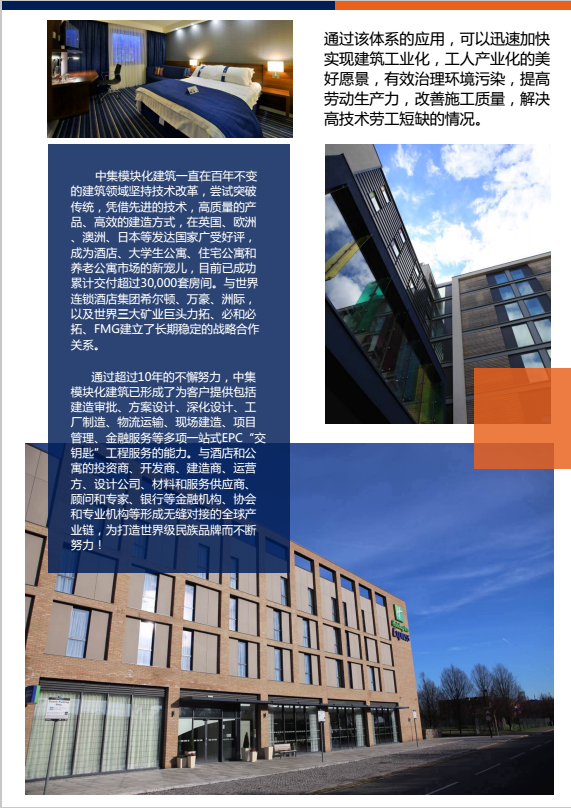 模塊化、工業化建筑是當今世界建筑施工最先進的生產方式。中集模塊化建筑起步于 2004 年,是中集集團旗下最具創新活力的新型業務,其產品以鋼結構為主體,是結合保溫、水電、消防、隔音、節能和內部精裝修于一體的新型建筑體系,相對于傳統建筑,它擁有可移動、重量輕、隔音好、抗震性能優、建造速度快、裝修質量高等特點,適用于永久性、半永久性和臨時性建筑,在酒店、學生公寓、住宅公寓和養老公寓等領域備受全球客戶贊譽。至今,已經成功進入英國、澳洲、日本等海外市場并廣受好評,近期將逐步進入新加坡、美國和中國市場。