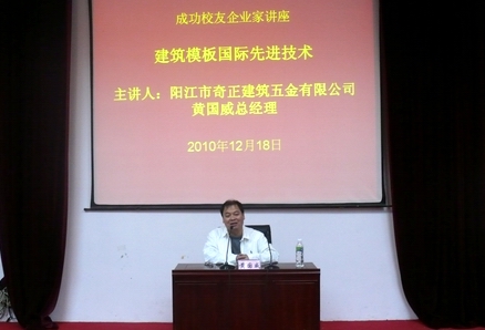 黃國威總經理首先介紹了本公司的腳手架、鋁模板的生產和研發做了詳細的講解,并對其國外的業務進行了詳細的介紹,在場的學生受益匪淺。接著,黃總給同學們講述他畢業以來的經歷和艱苦的創業歷程,希望通過分享幫助在校學生樹立正確的就業觀,鼓勵在校生要發揚吃苦耐勞的精神,要珍惜大學的美好時光。在如何真正實現自己的社會價值的問題上,他建議首先要結合自己的實際情況,樹立人生目標,然后要學會怎樣做人,提高人際溝通能力。對于畢業班的同學來說,他建議要踏實進取,不要在比自己學歷低的同事面前擺“高架子”。在大學生畢業是否自主創業問題上,他建議學生不要在沒有扎實的工作經驗的前提下盲目創業。