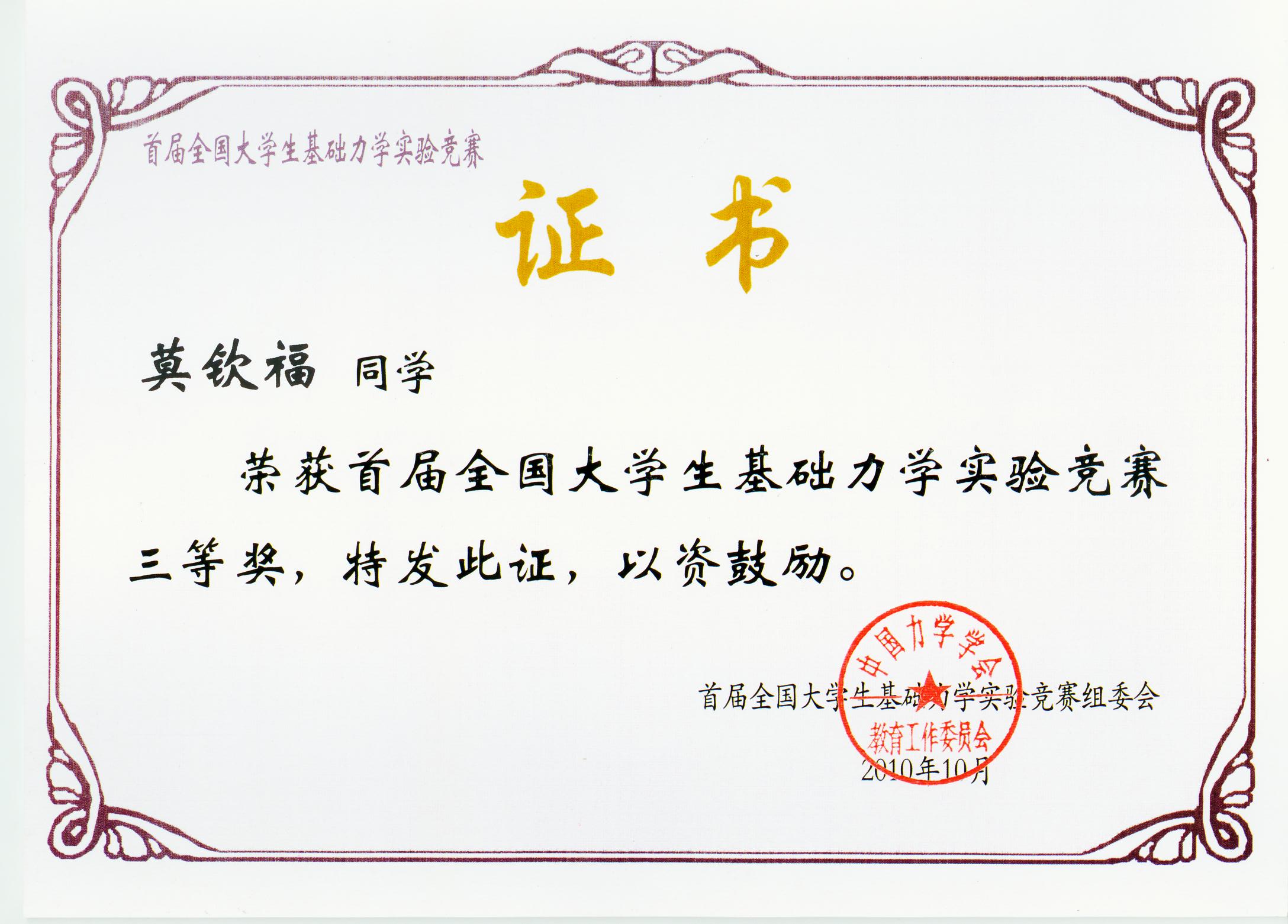 莫欽福-2010年首屆全國大學生基礎力學實驗競賽三等獎