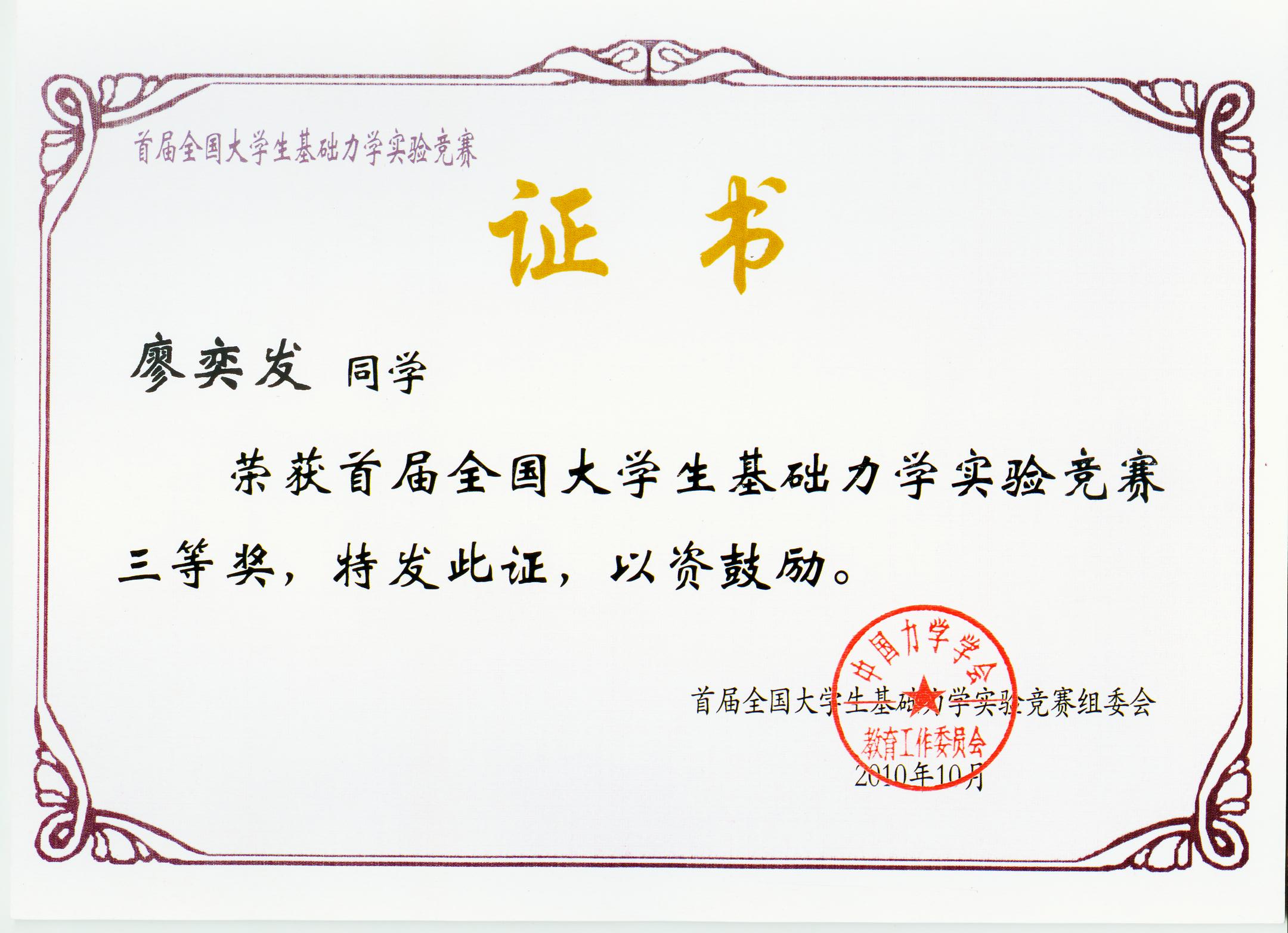 廖奕發-2010年首屆全國大學生基礎力學實驗競賽三等獎