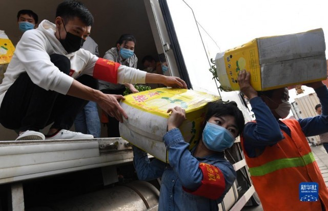 2020年3月3日,在廣西南寧國際鐵路港,南寧車務段“青年突擊隊”隊員黃瑩瑩(右二)在搬運廣西馳援湖北物資。新華社記者 陸波岸 攝