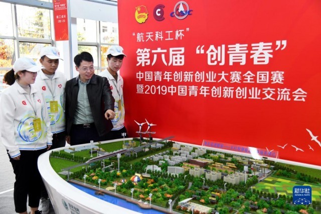 2019年11月1日,在山東青島舉行的第六屆“創青春”中國青年創新創業大賽全國賽暨2019中國青年創新創業交流會上,參會人員在給志愿者介紹新鄉村智慧能源服務模式。新華社記者 李紫恒 攝