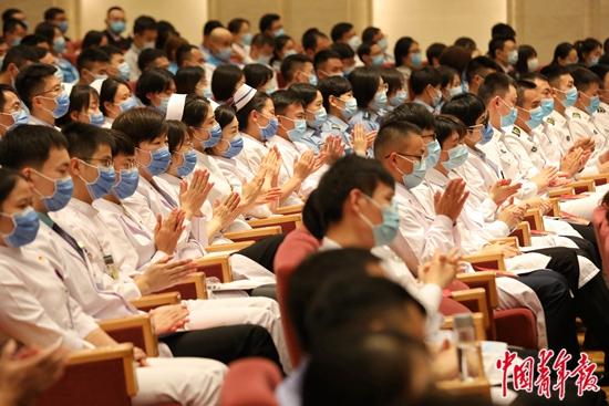 醫護人員在報告會上鼓掌。中青報·中青網記者 李建泉/攝