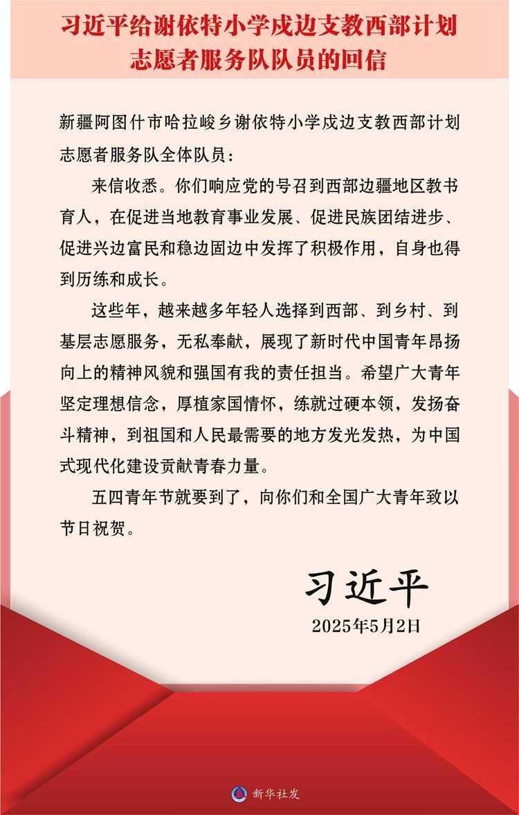 ??新華社北京5月3日電?在五四青年節到來之際,中共中央總書記、國家主席、中央軍委主席習近平給新疆克孜勒蘇柯爾克孜自治州阿圖什市哈拉峻鄉謝依特小學戍邊支教西部計劃志愿者服務隊全體隊員回信,向全國廣大青年致以節日祝賀并提出殷切期望。
