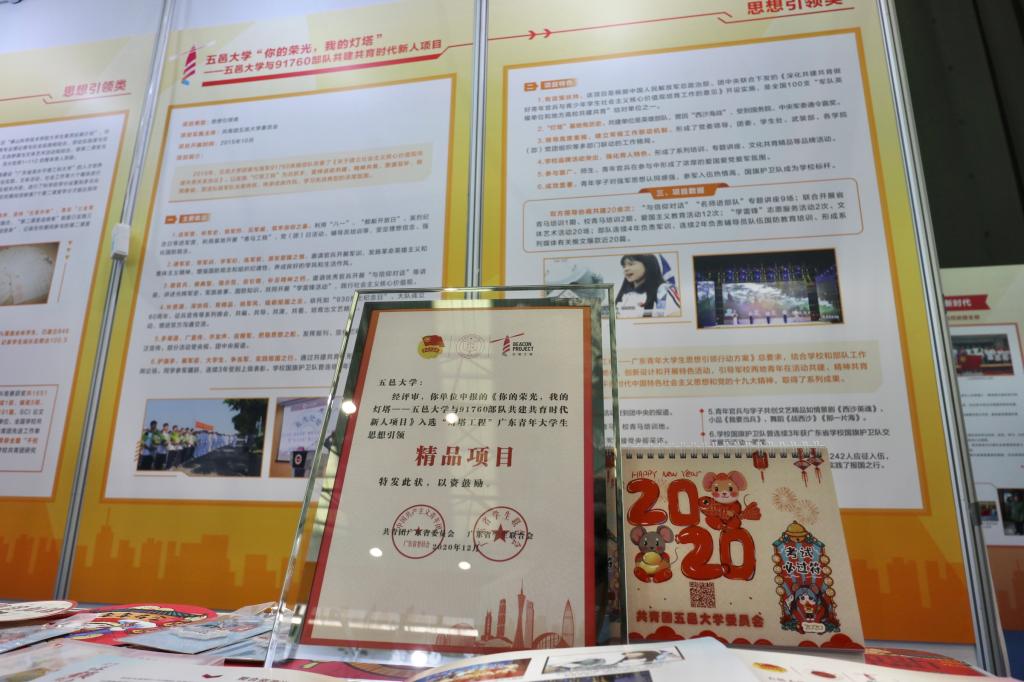 12月13日,由團省委、省學聯舉辦的“燈塔工程”廣東青年大學生思想引領建設成果展示交流活動在華南農業大學舉行。我校“你的榮光,我的燈塔——五邑大學與91760部隊共建共育時代新人項目”獲評“燈塔工程”廣東青年大學生思想引領精品項目(全省共15個項目獲評),并在展區集中展示我校共青團思想引領育人工作成果。此外,紡織材料與工程學院獲評2020年廣東省“活力在基層”主題團日競賽活動“十佳項目”——“‘邑’起抗疫·井蓋換裝變‘景蓋’”也在支部建設成果展區進行展示。