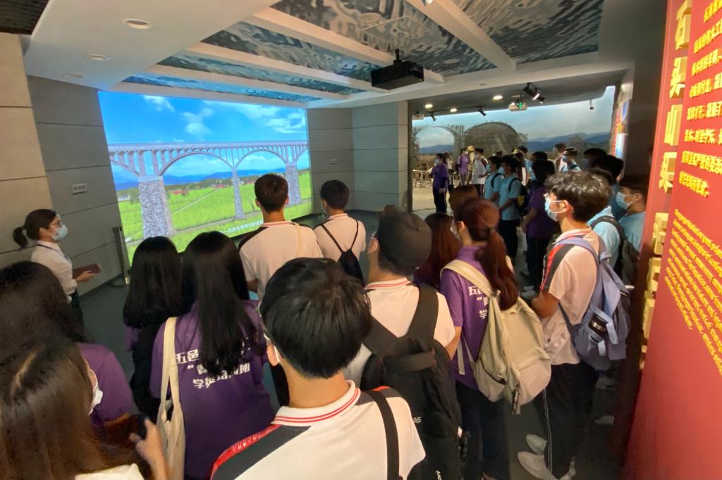 作為廣東省中共黨史教育基地的長崗坡紀念館,是云浮市依托長崗坡渡槽紅色資源建立的黨員教育基地。紀念館通過圖文展示的形式,結合3D立體全息投影技術,再現了當年在黨員干部帶頭、人民群眾齊心參與下,長崗坡工程乃至羅定全縣水利建設工程的艱苦奮斗歷程、波瀾壯闊場面和感人肺腑的故事。從當年“十年九旱”到如今“旱澇保收”,這一巨大轉變是發揮黨的群眾路線優勢的最好印證,生動展現了“牢記宗旨、無私奉獻的為民精神,敢為人先、攻堅克難的擔當精神,求真務實、艱苦奮斗的實干精神”的長崗坡精神。登高俯瞰廣東省文物保護單位長崗坡渡槽,同學們無不被其規模和長度所震撼,被其所承載的歷史價值和精神實質所感染。