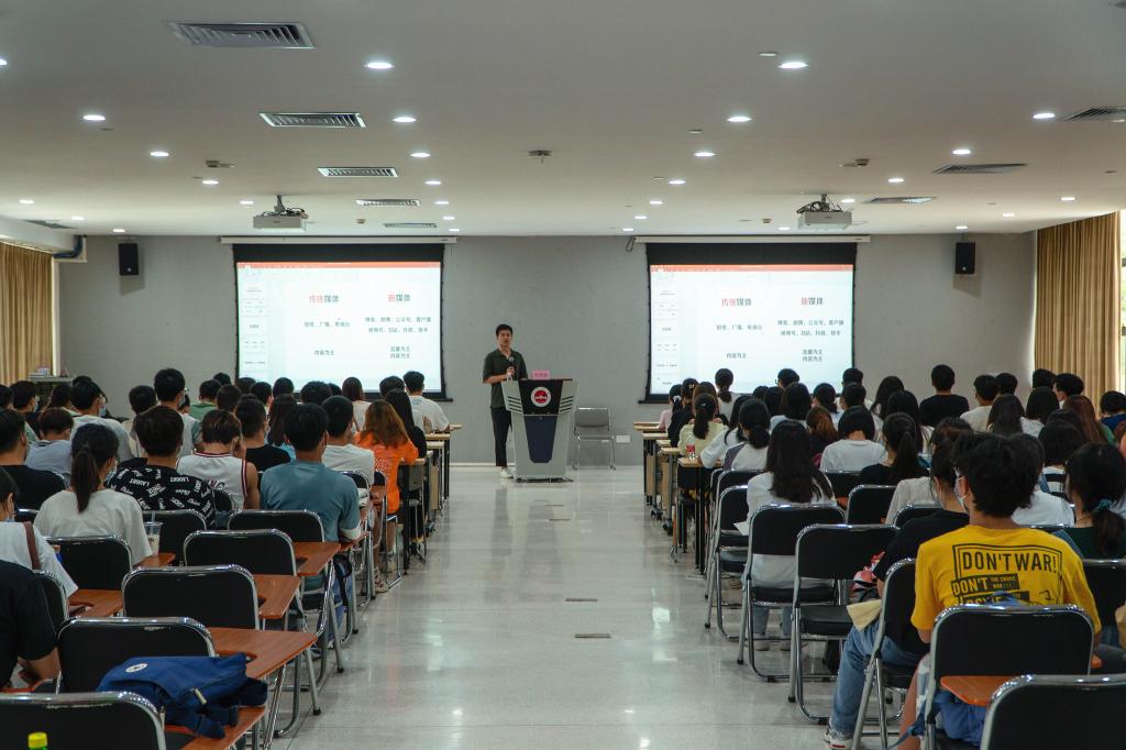 吳堅欽結合個人參與運營“廣東共青團”“12355青年之聲”等團屬微信公眾號及抖音、B站等短視頻平臺的工作經歷,分別從如何構建政務新媒體的話語權與權威性、團屬新媒體平臺的傳播理念及如何面向青年群體進行正向價值引導、如何打造符合平臺調性及青年喜聞樂見的短視頻產品等進行了經驗分享。在交流互動環節,吳堅欽詳細解答了同學們在新媒體運營工作中遇到的困惑,并圍繞新媒體團隊建設、熱點分析與選題策劃展開具體講解。