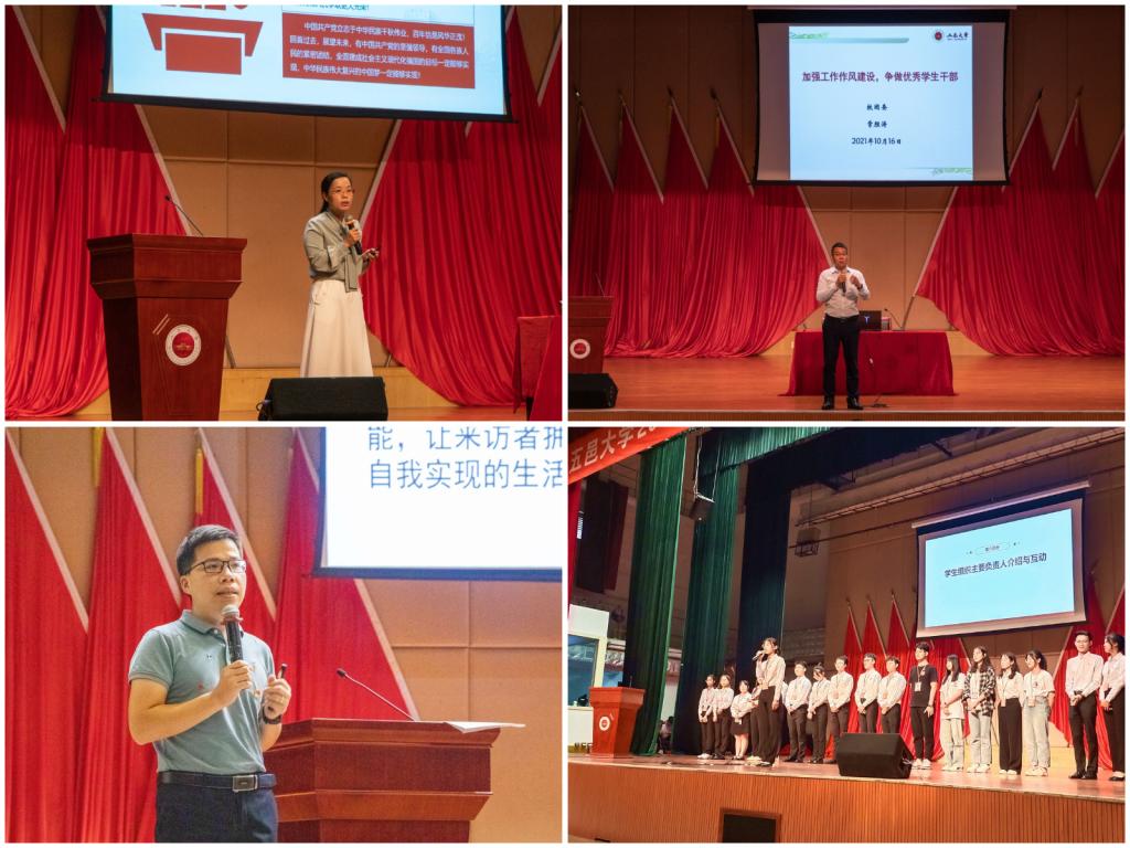 在開班儀式上,校團委全體老師寄語新生干部,希望同學們在實踐中收獲,在歷練中成長,共同打造信念堅定、品學兼優、朝氣蓬勃、心系同學的學生組織;校團委書記羅丹以《學習講話精神,增強做中國人的志氣、骨氣、底氣》為題,作“七一”重要講話精神學習報告,寄語同學們在理論學習與實踐鍛煉中增強“腳力、眼力、腦力、筆力”,長志氣、強骨氣、厚底氣,成長為不負時代、不負韶華、不負黨和人民殷切期望的新時代青年;校團委副書記常勝濤以《加強工作作風建設,爭做優秀學生干部》為題,強調“學習是學生的第一要務”,并希望各學生組織創新工作思維、嚴管組織骨干、強化作風建設,引導學生干部爭做服務學生成長的“同行者”;數學與計算科學學院輔導員唐鐵橋帶來《教練技術視角下的高校學生干部時間管理與心理調適》專題培訓,通過游戲互動、實例分享,教育引導同學們以“教練式”的方式科學分配時間,并從情緒管理、關系處理、壓力緩解等方面幫助同學們進行心理調適。