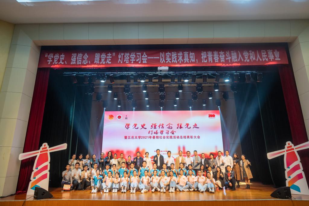 10月24日晚,由校團委舉辦的“學黨史、強信念、跟黨走”燈塔學習會暨五邑大學2021年暑期社會實踐活動總結表彰大會在呂和禮堂舉行。校黨委常委、副校長、組織部部長李霆及學校學生處、團委、美育教育中心等職能部門負責人、學院(部)黨組織書記、副書記、團組織書記出席大會,包括校青馬學員在內的900余名學生代表與會學習。