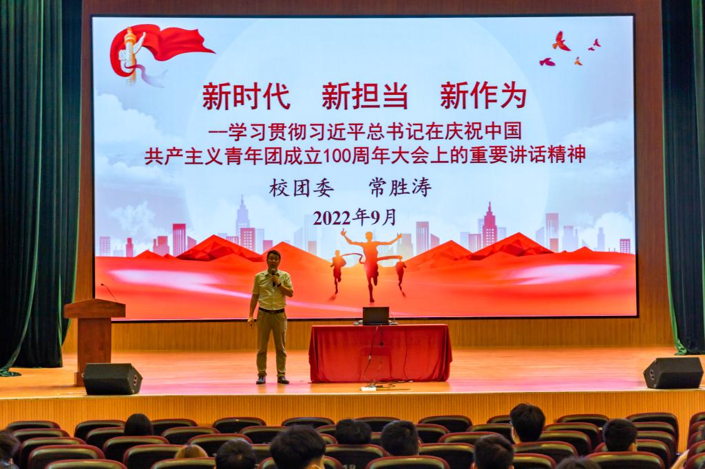 校團(tuán)委副書記常勝濤以《新時(shí)代 新?lián)?dāng) 新作為——學(xué)習(xí)貫徹習(xí)近平總書記在慶祝中國共青團(tuán)成立一百周年大會(huì)上的重要講話精神》為題,帶領(lǐng)同學(xué)們共同回顧共青團(tuán)跟黨奮斗的百年光輝歷程。常老師強(qiáng)調(diào)“青年有理想有擔(dān)當(dāng),國家就有前途有希望”,希望同學(xué)們要將大會(huì)精神內(nèi)化為勤學(xué)善思、苦練本領(lǐng)、立志報(bào)國的精神動(dòng)力,追求政治進(jìn)步,提高素質(zhì),學(xué)而時(shí)習(xí)之,堅(jiān)定理想信念,爭做有為青年。