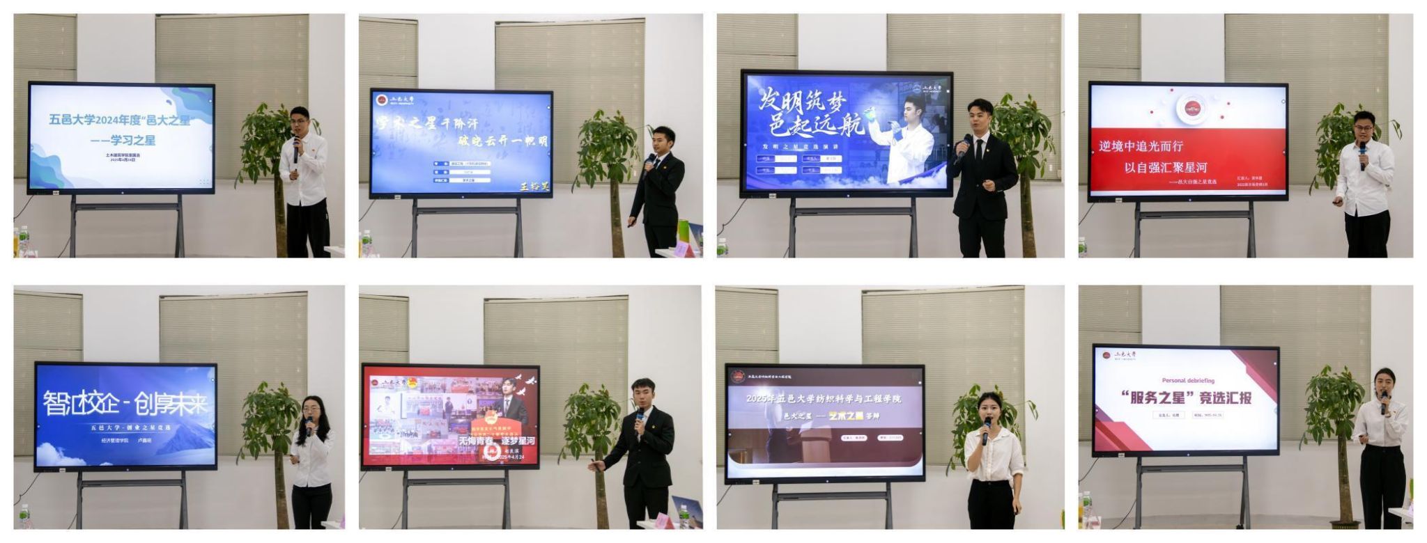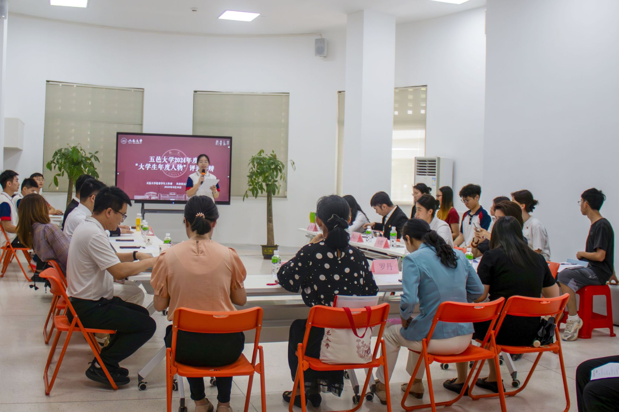 為樹立青年榜樣,弘揚奮斗精神,4月24日,五邑大學2024年度“大學生年度人物”評選答辯在學生綜合服務中心104舉行。本次評選活動經過“宣傳發動-院級推選-校級復選-終審答辯”的評審程序,由黨委學生工作部、團委等職能部門負責人、相關工作人員及各學院學生代表組成的評審團,對入圍終審的候選人進行綜合評審。