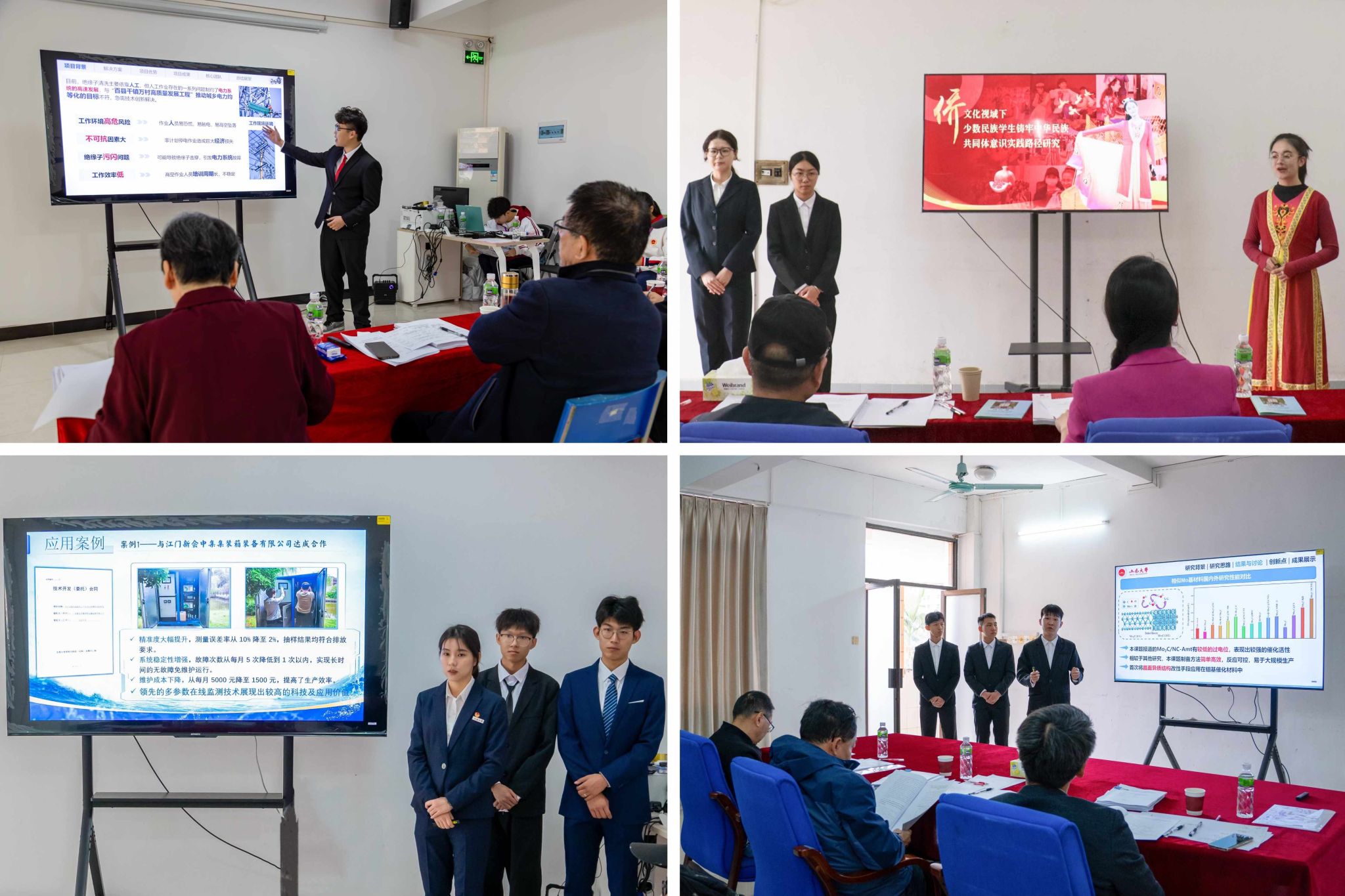 校賽現場,經學院推薦、校級評審脫穎而出的34個創新項目同臺競技,通過閉館質詢、作品演示、項目答辯,展示項目的背景與意義、科學性與先進性、社會價值、發展前景、團隊協作等內容。評審專家們從專業角度出發,根據省賽評審要求及項目實際情況,為參賽團隊提供改進意見和建議。