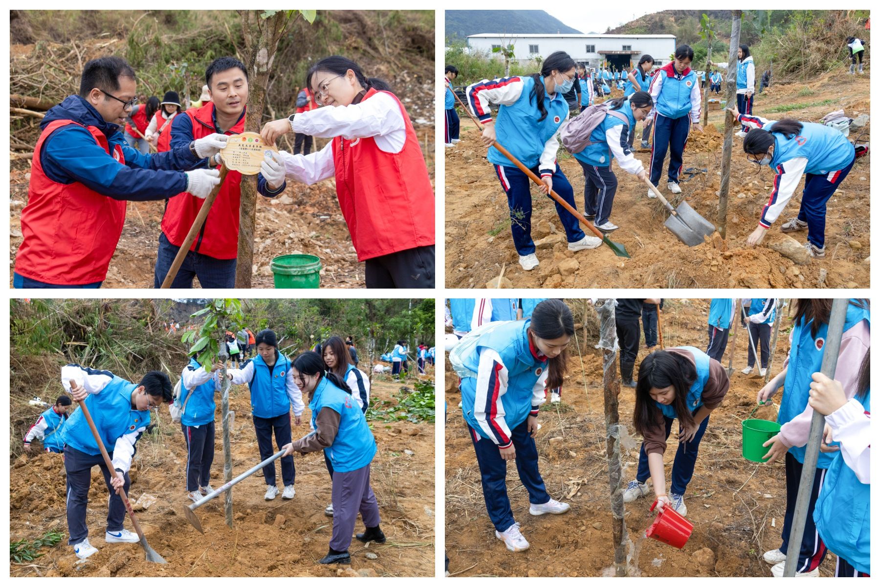 蘋婆蔭夏,鳳凰來?xiàng)?,活?dòng)現(xiàn)場呈現(xiàn)出一派熱火朝天的勞動(dòng)景象。師生腳踩黃土,揮鍬鏟土、扶苗填坑,將蘋婆樹苗植入土壤,提水澆灌生命的希望。入黨紀(jì)念樹、畢業(yè)紀(jì)念樹、青春樹、成長樹、幸福樹……師生親自為認(rèn)捐樹木掛上專屬銘牌,許下象征希望的美好愿景,為鄉(xiāng)村增添盎然生機(jī)?!八闹刃交?,僑蘊(yùn)新篇,五邑大學(xué)更輝煌!”伴隨著嘹亮的口號(hào)聲,志愿植樹活動(dòng)圓滿落幕。