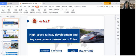 黃莎博士作了題為“High-speed railway development and key aerodynamic issues in China”的講座,介紹了世界鐵路發展歷史及中國鐵路發展的偉大成就,重點講解了鐵路高速發展過程中面臨的空氣動力學問題及解決方案,包括氣動減阻降噪技術、隧道耦合氣動效應及緩解技術、大風環境下列車安全防護技術等;同時,介紹了國際前沿仿生減阻降噪、湍流流場主動控制技術在高速列車領域的應用;最后,介紹了我國目前正在開展的高速鐵路建設情況,如智慧京張鐵路、時速600公里高速磁浮等,并與學生進行了線上互動,探討了未來軌道交通發展。