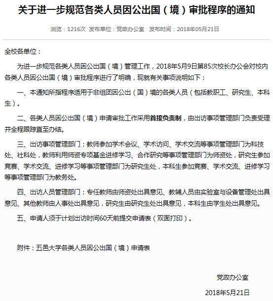 為進一步規范各類人員因公出國(境)管理工作,2018年5月9日第85次校長辦公會對校內各類人員因公出國(境)審批程序進行了明確,黨政辦已于2018年5月21日在校園網發布通知,現將通知內容附下,請各類因公出國(境)人員按通知要求,下載附件表格,填寫申報。