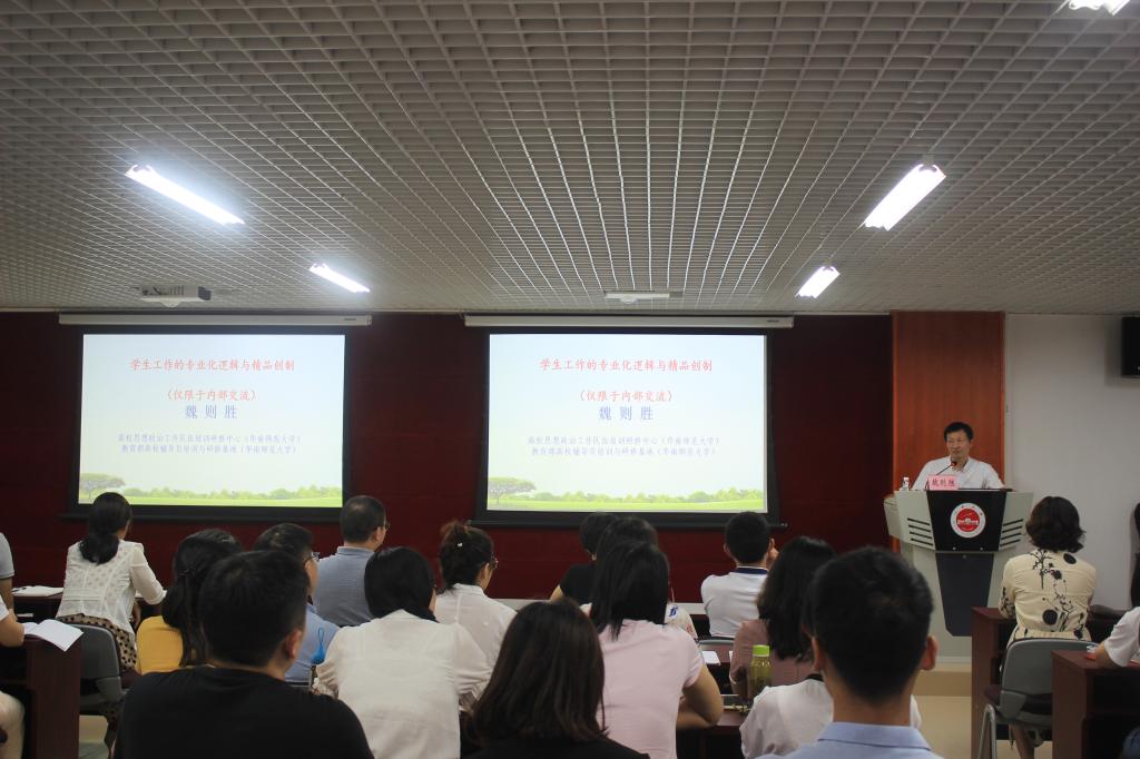 10月11日下午,教育部高校輔導員培訓和研修基地(華南師范大學)常務副主任魏則勝教授在北主樓1510室為我校輔導員作《學生工作的專業化邏輯與精品創制》專題講座,學生工作部(處)成員、各學部黨委(學院黨總支)副書記、輔導員參加了培訓。