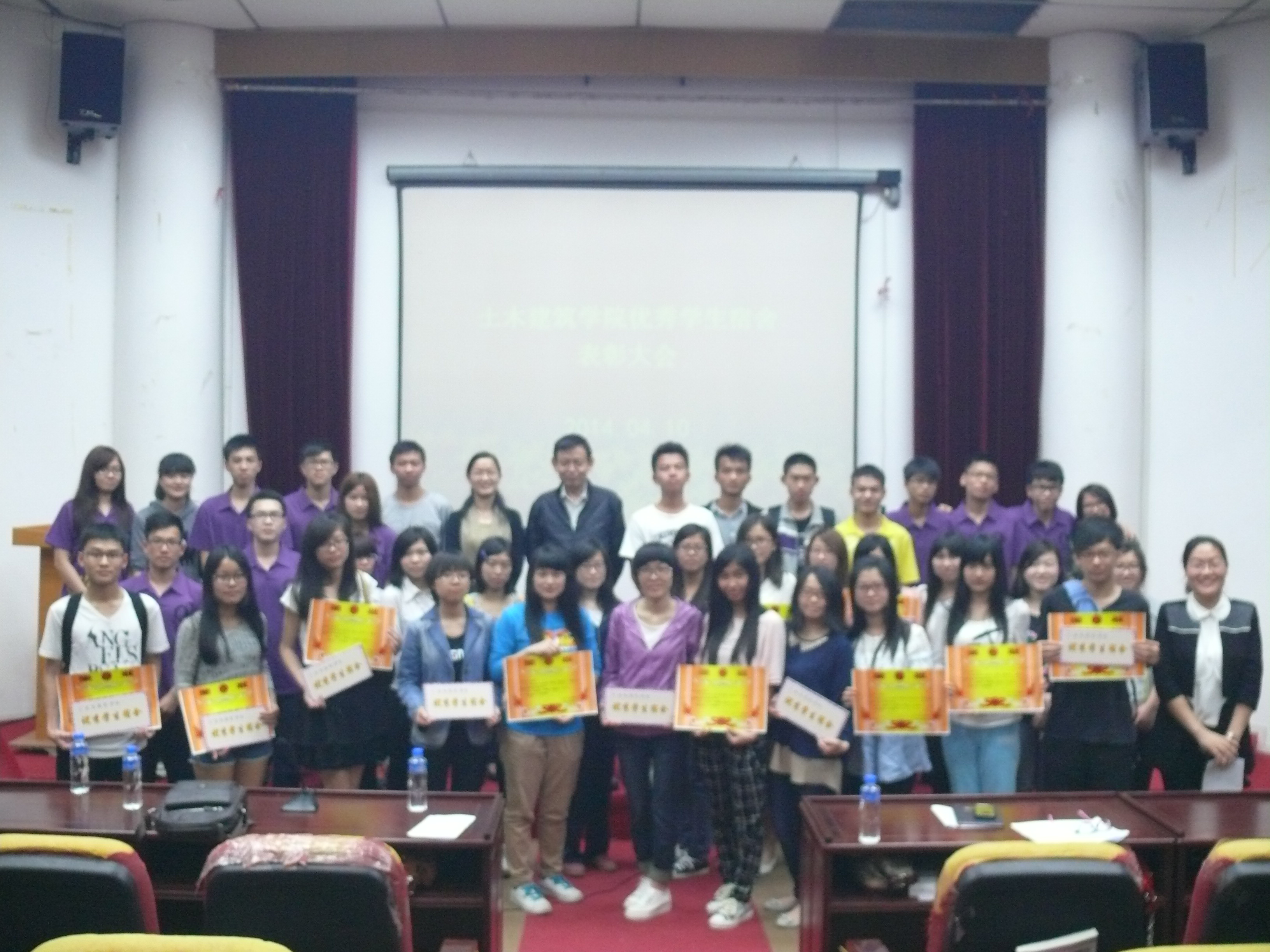 2014年4月10日下午,土木建筑學院在順德堂召開十大優秀學生宿舍表彰大會。院長兼黨總支書記周利老師、黨總支副書記李華老師、獲獎學生及近150名學生宿舍舍長參加了大會。會議由輔導員高麗麗老師主持。